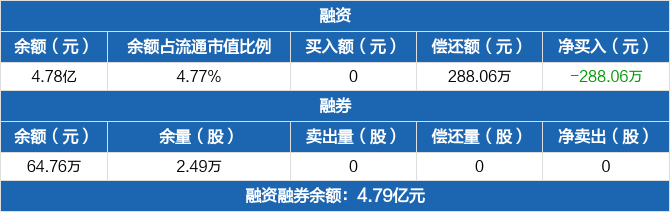 融资方面,当日融资买入0元,融资偿还288.06万元,融资净偿还288.06万元,连续9日净偿还累计3014.33万元。融券方面,融券卖出0股,融券偿还0股,融券余量2.49万股,融券余额64.76万元。融资融券余额合计4.79亿元。