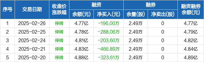 融资方面,当日融资买入0元,融资偿还196万元,融资净偿还196万元,连续10日净偿还累计3210.33万元。融券方面,融券卖出0股,融券偿还0股,融券余量2.49万股,融券余额64.76万元。融资融券余额合计4.77亿元。