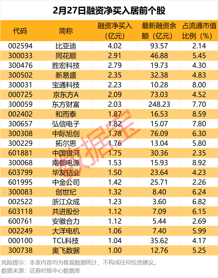 具体到个股,2月27日共有22只股融资净买入额超亿元。比亚迪融资净买入额居首,当日净买入4.02亿元;其次是同花顺、胜宏科技,融资净买入金额分别为2.91亿元、2.79亿元,融资净买入金额居前的还有新易盛、宝通科技、京东方A等。