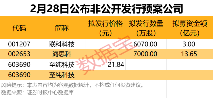 2月28日共有3家公司公布非公开发行预案。至纯科技今日复牌后一字涨停。
