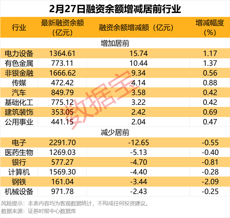 分行业统计,申万所属一级行业有17个行业融资余额增加,电力设备行业融资余额增加最多,较上一日增加15.74亿元;融资余额增加居前的行业还有有色金属、非银金融、传媒等,融资余额分别增加10.44亿元、9.34亿元、4.14亿元;融资余额减少的行业有14个,电子、医药生物、银行等行业融资余额减少较多,分别减少12.65亿元、5.13亿元、4.70亿元。