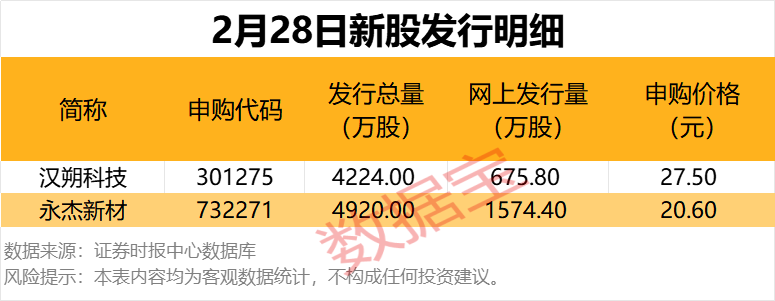 今日(2月28日)共有2只新股申购,分别为沪市主板的永杰新材,创业板的汉朔科技。