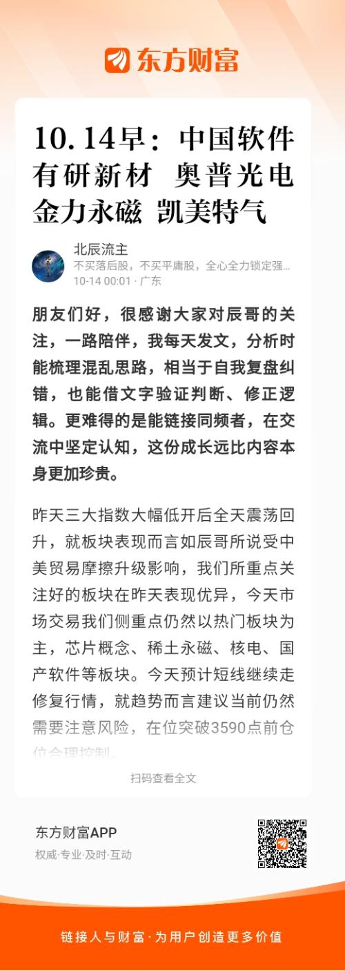 昨天三大指数大幅低开后全天震荡回升,就板块表现而言如辰哥所说受中美贸易摩擦升级影响,我们所重点关注好的板块在昨天表现优异,今天市场交易我们侧重点仍然以热门板块为主,芯片概念、稀土永磁、核电、国产软件等板块。今天预计短线继续走修复行情,就趋势而言建议当前仍然需要注意风险,在位突破3590点前仓位合理控制。
