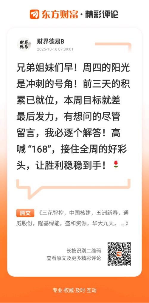 很棒//@财界德易B :兄弟姐妹们早!周四的阳光是冲刺的号角!前三天的积累已就位,本周目标就差最后发力,有想问的尽管留言,我必逐个解答!高喊 “168”,接住全周的好彩头,让胜利稳稳到手! $至纯科技(SH603690)$$和顺电气(SZ300141)$$上海电力(SH600021)$