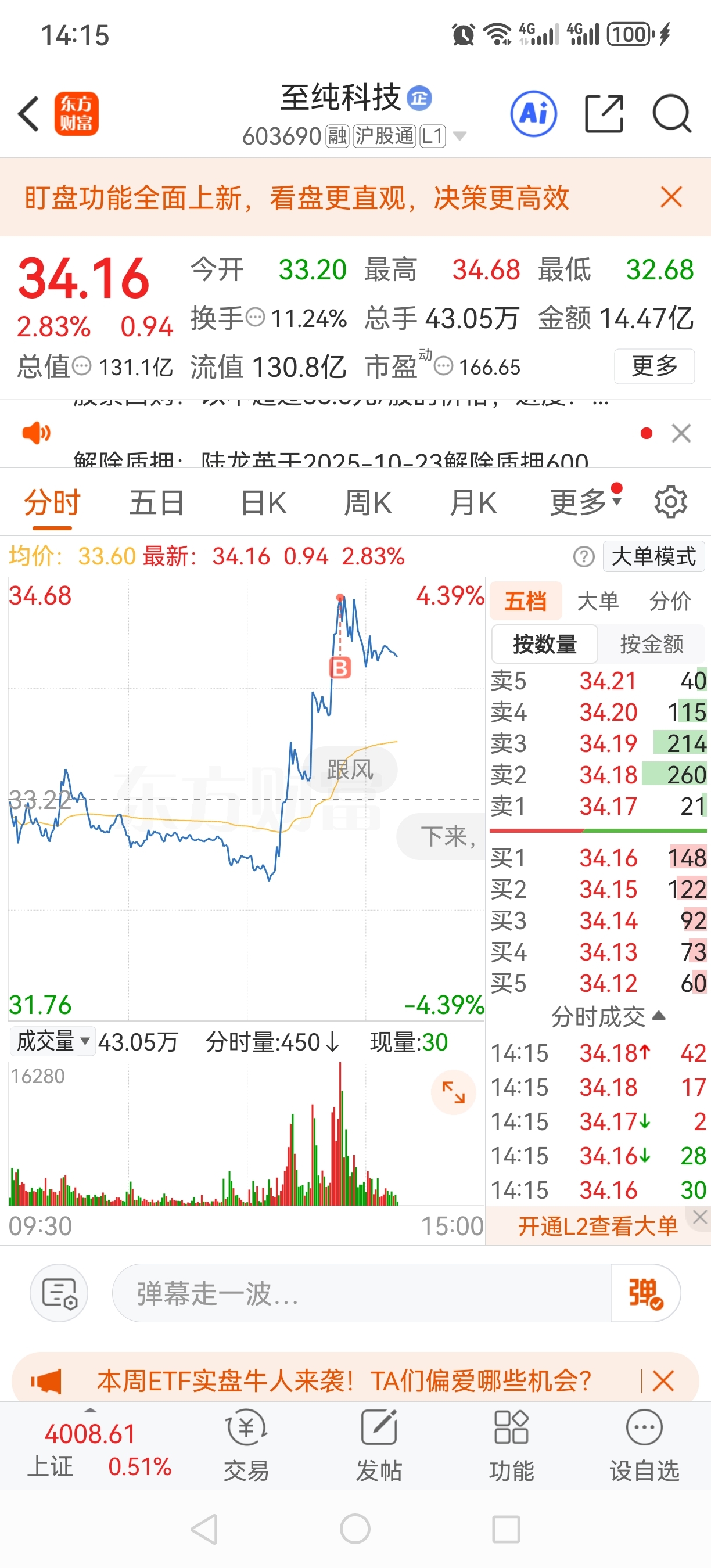 $至纯科技(SH603690)$ 都怪我34.55买了100手,对不起大家了