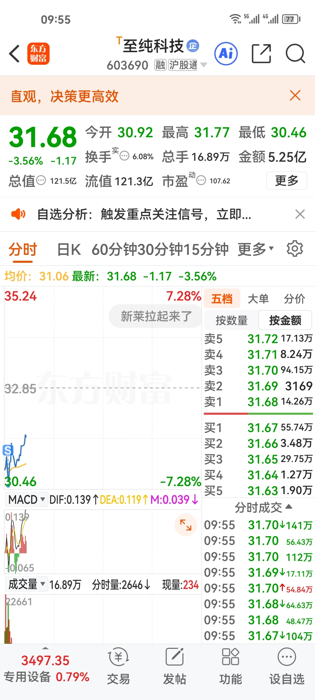 $至纯科技(SH603690)$  谁能体会我现在的心情,前天高点买的,今天最低点卖的