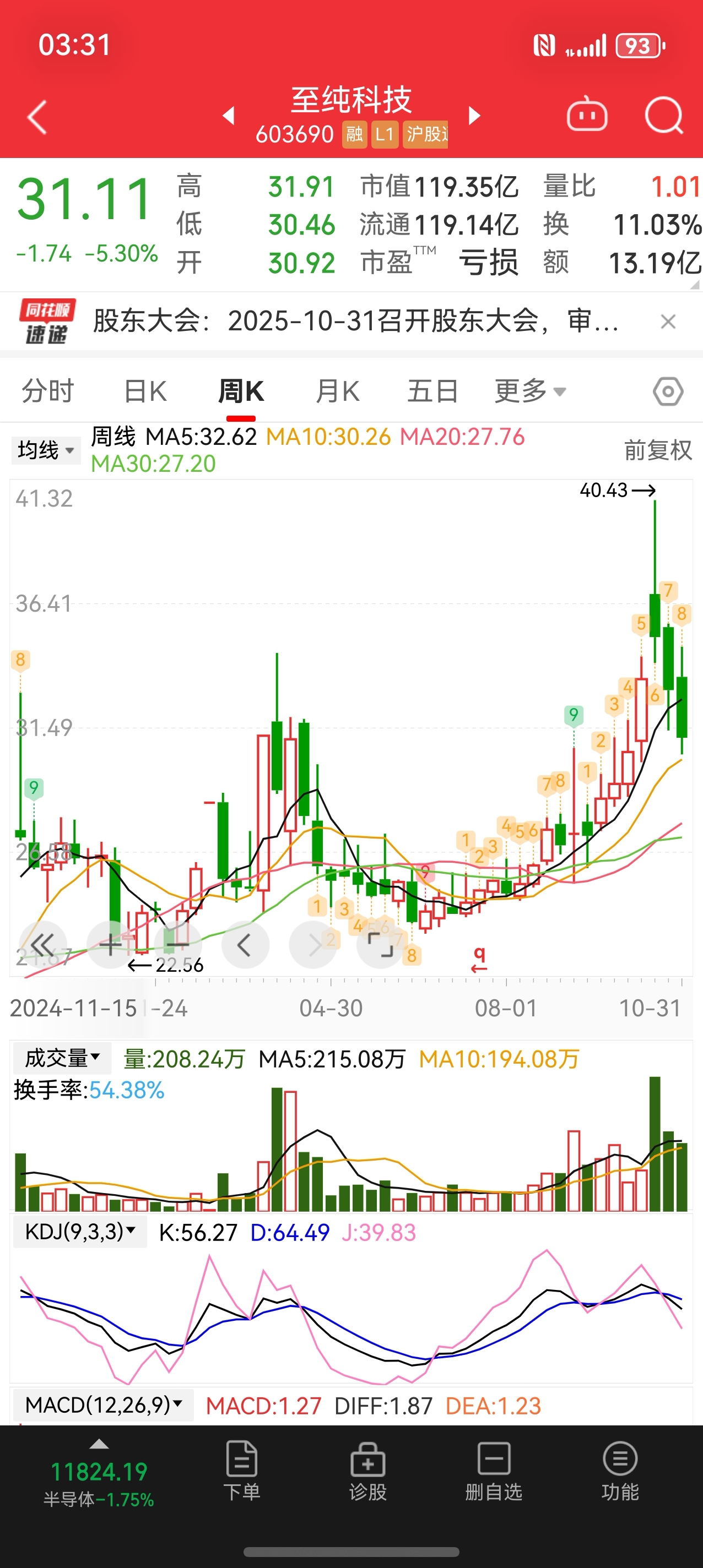 $至纯科技(SH603690)$ 尾盘31.11建的仓,不用怕,周线上升第八转,理论上下周应该拉起来