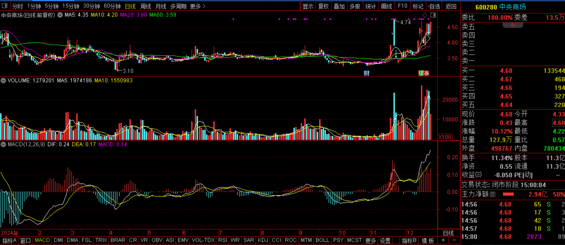 $中央商场(SH600280)$(SZ600280):百货零售+中华老字号+罗森便利店+政策提振消费。该股是商业百货的后起之秀,是“中华老字号”品牌,拥有九十年品牌积淀及优质供应商资源,江苏区域招商影响力领先,正持续推进央厨、罗森便利、仓储、物流配送核心产业链协同发展,持续拓展便利店业务,是当前市场热点,股价处于低位,估值偏低,后市随着消费的提振,业绩具备上修预期,估值有上升空间。从技术的角度看,该股自从11月18日首次拉涨封板以来,其后连续冲高不过很快遇阻回落,之后强势震荡,但依旧牢牢收在60日线附近,近期开始再次走强,尤其是昨日再度封板,并缩量这是典型的筹码足够集中,市场一致看好后市的表征,料后市继续走涨,加速上涨可以期待。预计今日该股或再次拉新高,日内关注的是4.74能否突破,成功的话,后市继续走涨无忧,分歧走水的话,还是应该研究尝试的。如果继续拉涨,再新高突破强阻力位5.65的话,新的上涨空间打开。
