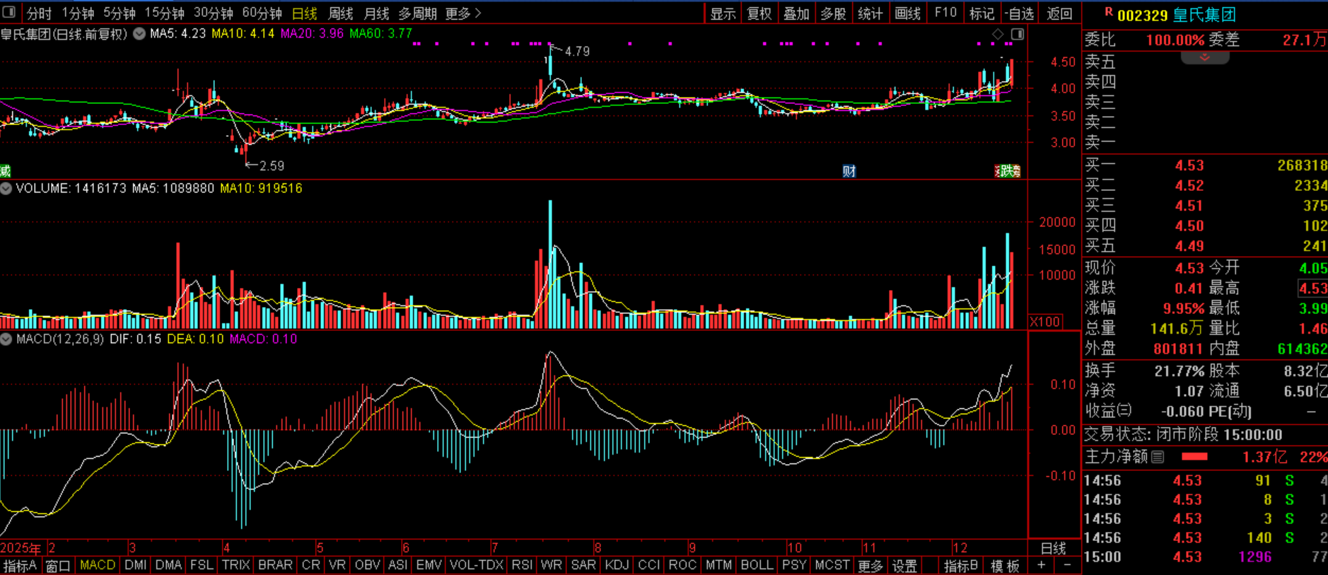 $皇氏集团(SZ002329)$(SZ002329):水牛奶+三胎概念+奶啤乳业+光伏+种源突破+跨境电商。公司核心主业为以水牛奶、发酵乳、巴氏鲜奶为主的特色乳品,覆盖牧草种植到销售服务全产业链,并加快长三角、大成渝、大湾区市场扩张。公司与大型园区食品正式签署战略合作协议,正式介入新时茶饮、乳品头部,这是布局新消费重要的一环,而当前消费又是GJ大力推崇的,所以该股具备估值上修预期。从走势来看,该股近期虽强势震荡,但底部抬升,下跌放量但是股价并未大幅走低,这是新紫金进场,猪力震仓洗盘的手法,昨日该股再次温和放量封板,这是趋势的恢复,料后市继续走高无忧。预计今日该股有望再次拉涨,如果能顺利突破4.79的话,后市或加速拉涨,值得深度研究探索。
