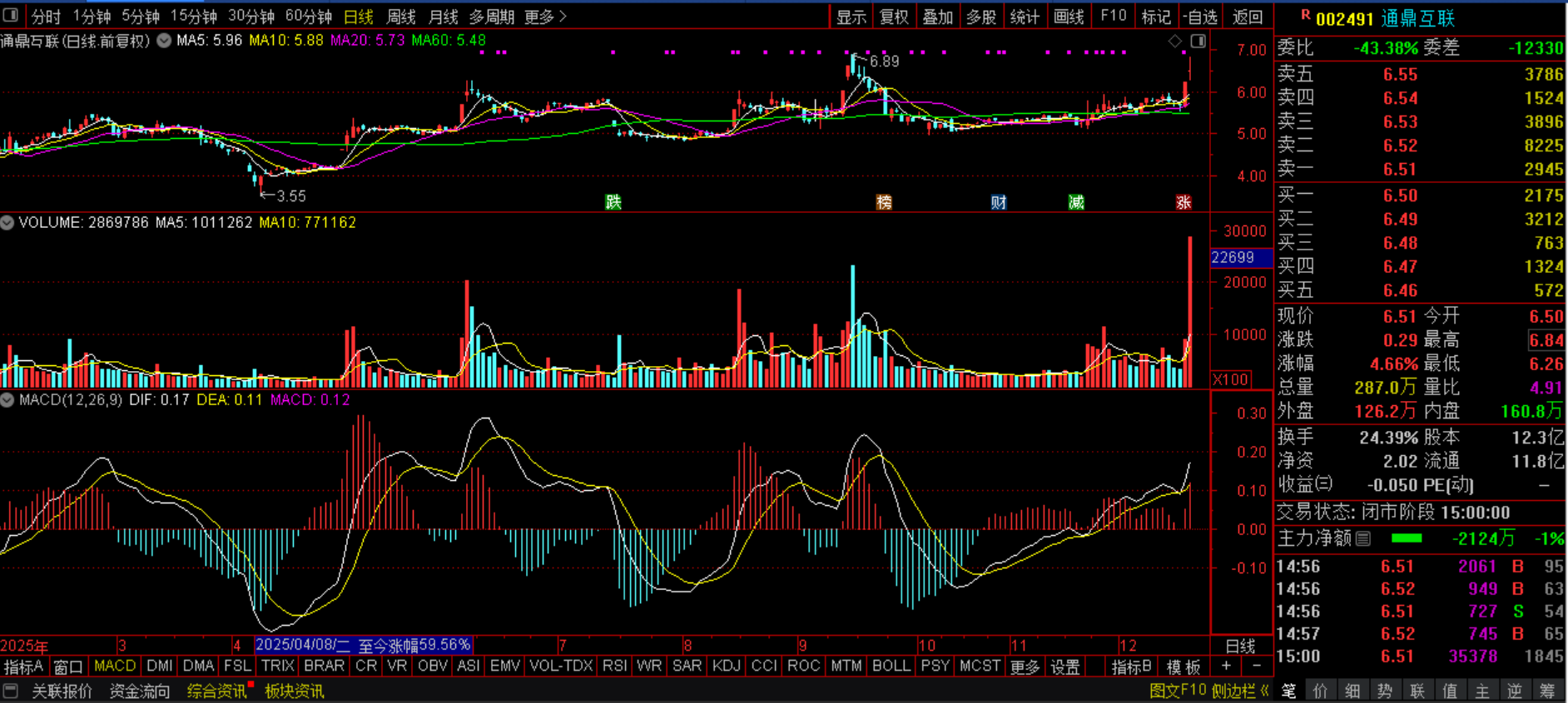 $通鼎互联(SZ002491)$(SZ002491):固态电池+通信线缆+储能消防+光纤光缆+光通信+数字水印+业绩增长。昨日该股早盘冲高封板,不过尾市炸板量能创历史,这种走势一般是后市具备可能的,因为低位放量往往是大紫金进场的信号,而该股又是电池、线缆与光通信的票,甚至间接具有商业航天概念,所以其上涨逻辑是非常坚实的,而其股价并不高,所以笔者坚定看好该股后市。料今日该股或探底拉涨,如分歧走水的话,可能是良机,值得考虑。