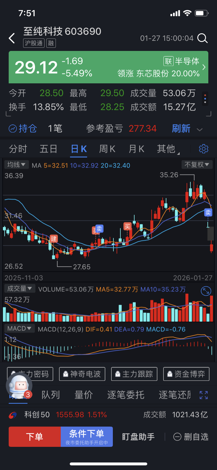 $至纯科技(SH603690)$ 周一减了一半,剩下一半死扛,结果周二吃大面。今天有个小反弹修复就清仓。好好的上升趋势硬生生被突发业绩雷搞废了,防不胜防。本打算一直持有的,现在就没必要死磕了。因为这家公司不地道,公司管理层及实控人心术不正。