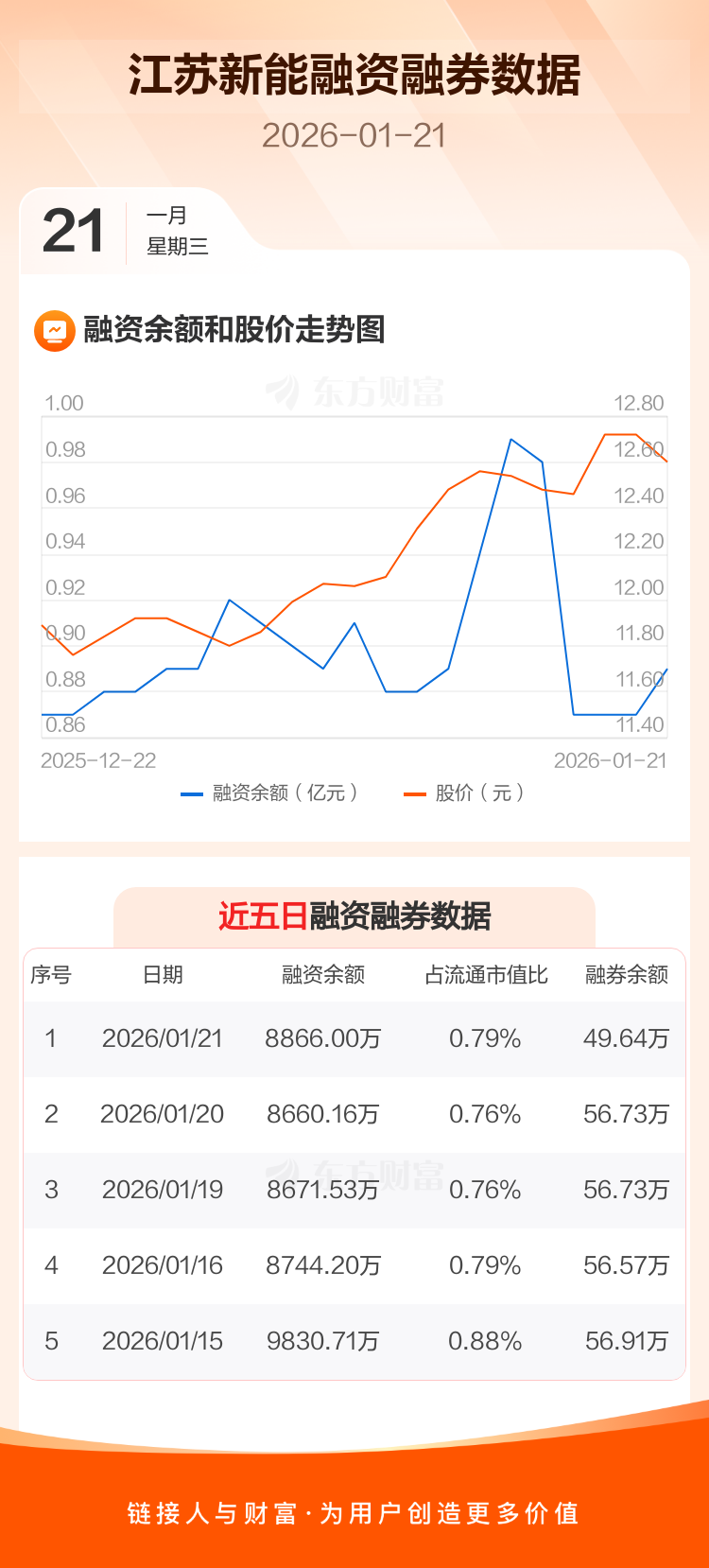 交易所最新数据显示,江苏新能于2026年1月21日获融资买入466.94万元,融资偿还261.09万元,当日融资净买入205.84万元。目前,该股融资余额8866.00万,占流通市值比例为0.79%。