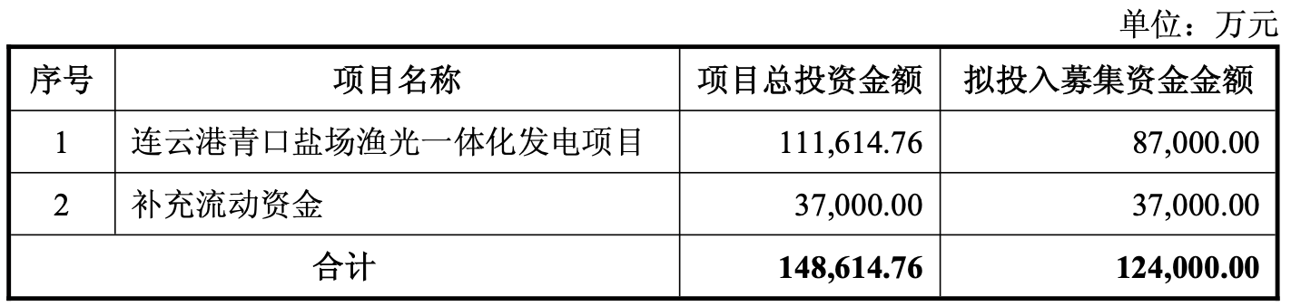 2月10日,江苏新能(603693)发布公告,公司拟向不特定对象发行可转换公司债券,募集资金总额不超过12.4亿元。扣除发行费用后,募集资金净额将用于投资“连云港青口盐场渔光一体化发电项目”和补充流动资金。