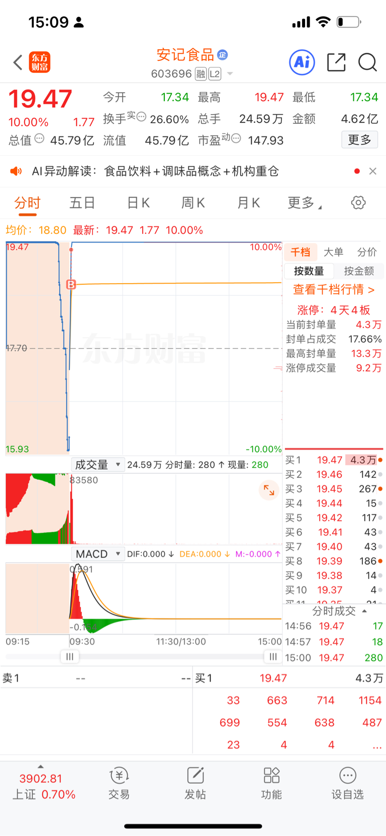 $安记食品(SH603696)$ 跳空高开,两次废单没买上,本来可以吃10个点的,最后差点变成打板,手机炒股太不方便了