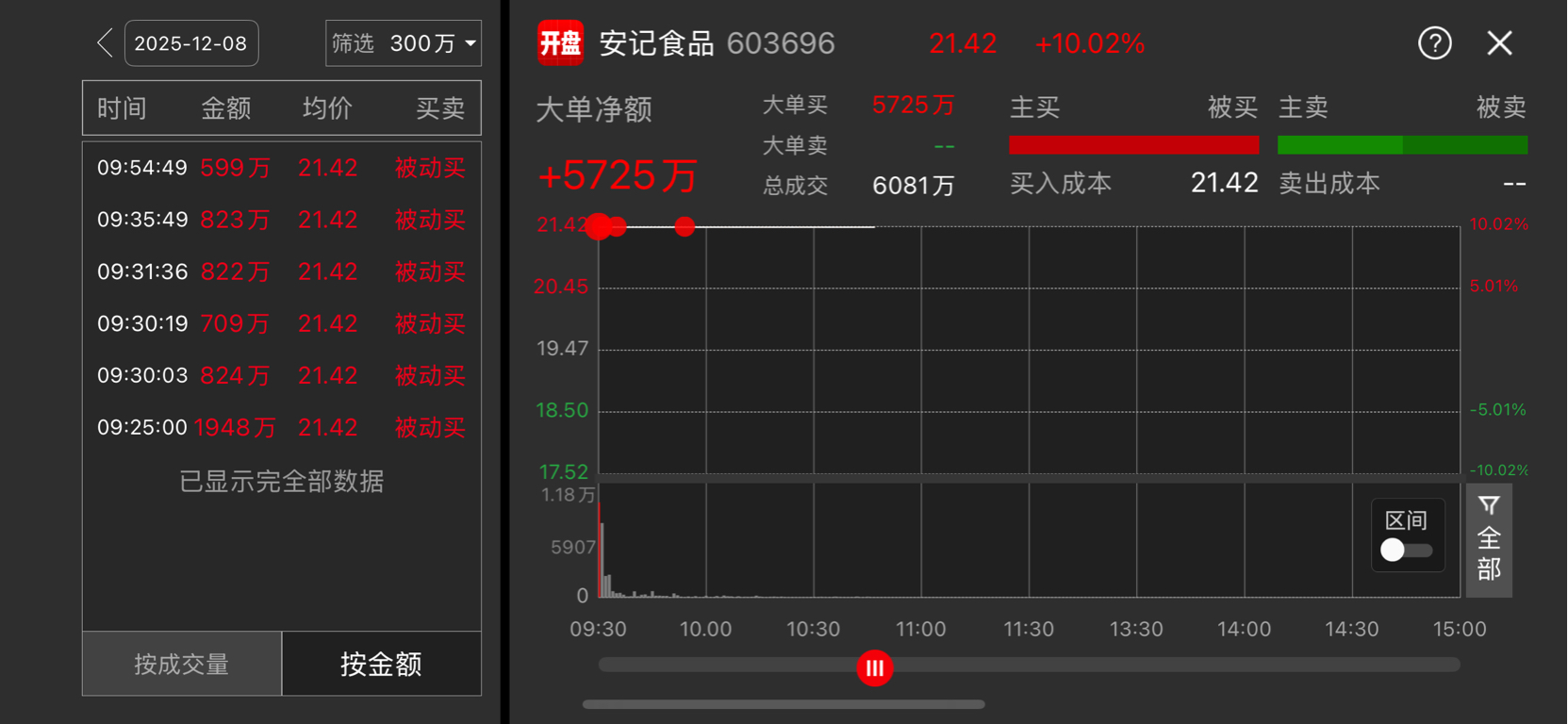 $安记食品(SH603696)$ 总共就六千万成交量,300万以上大单就买了5700万,主力大单优先抢走了散户筹码X