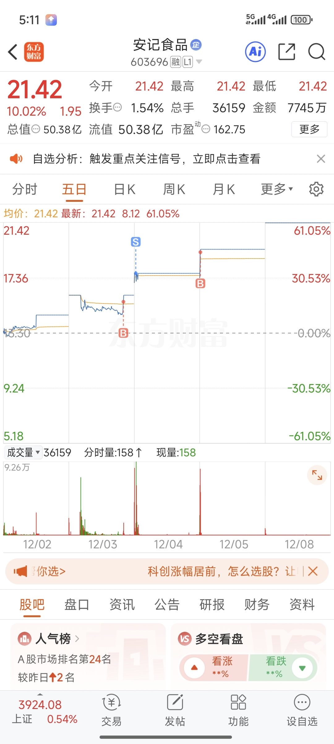 $安记食品(SH603696)$ 还好周5追回来了,差点被洗了