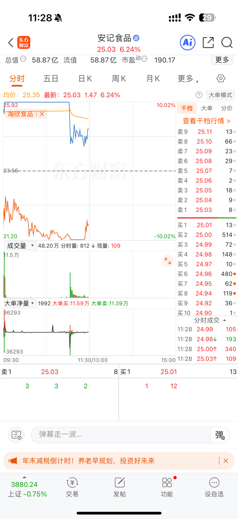 $安记食品(SH603696)$ 安记破板的时候海欣食品跌停,海欣有资金翘板,安记还有希望回封