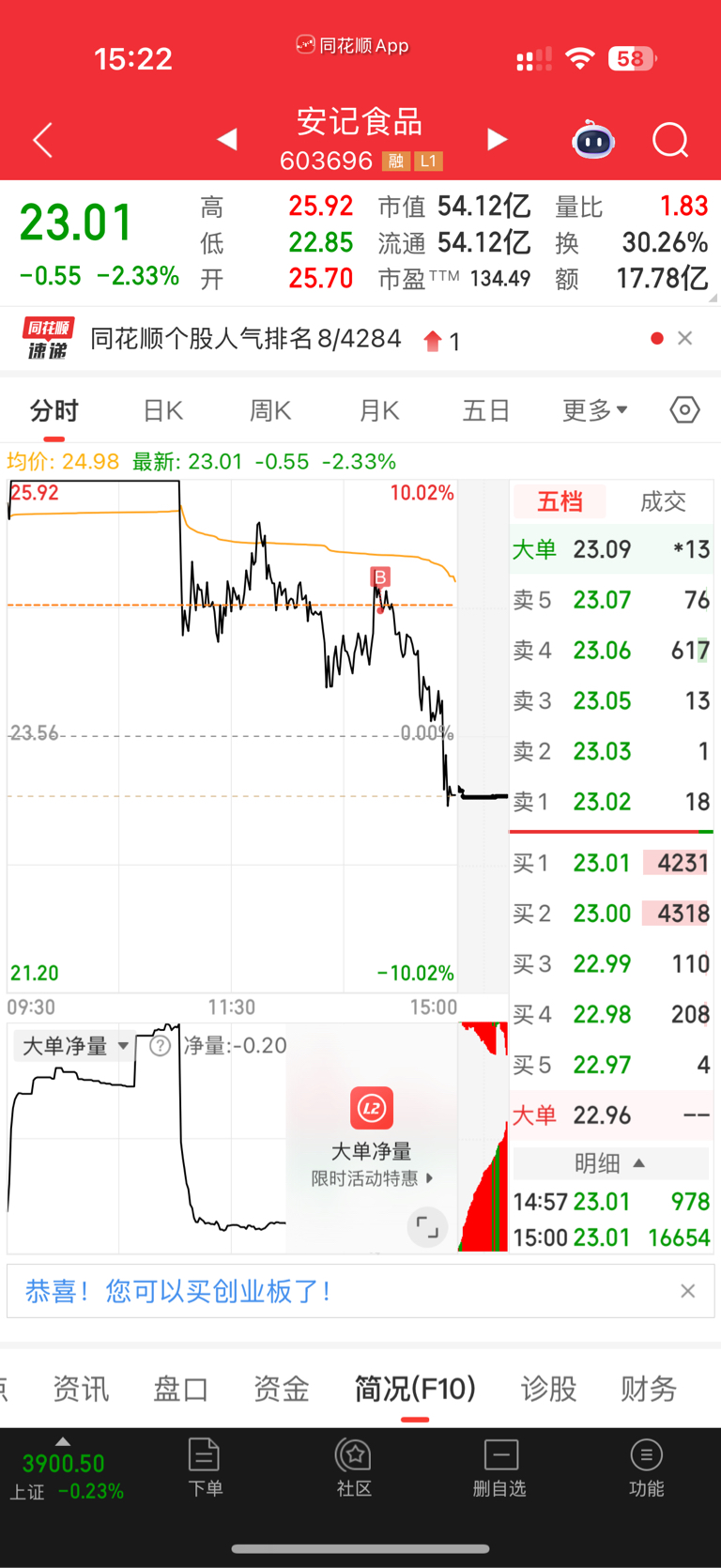 $安记食品(SH603696)$ 我看承接还可以啊。怎么给我砸到水下了。明天应该地板开了吧?还好就买了一手,亏了175。