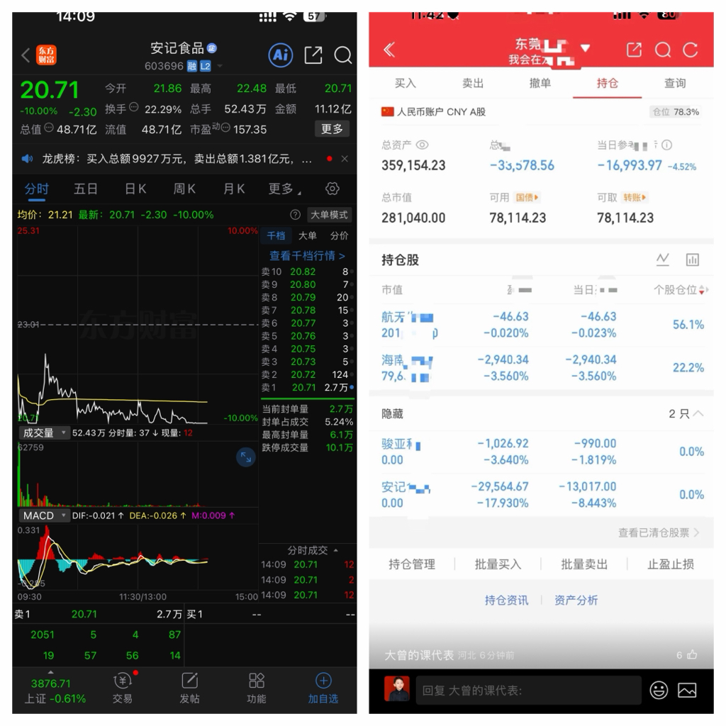 神经病大曾子昨天进的安记食品连闷二个跌停亏损地板割肉出局,然后又追进了疑似航天发