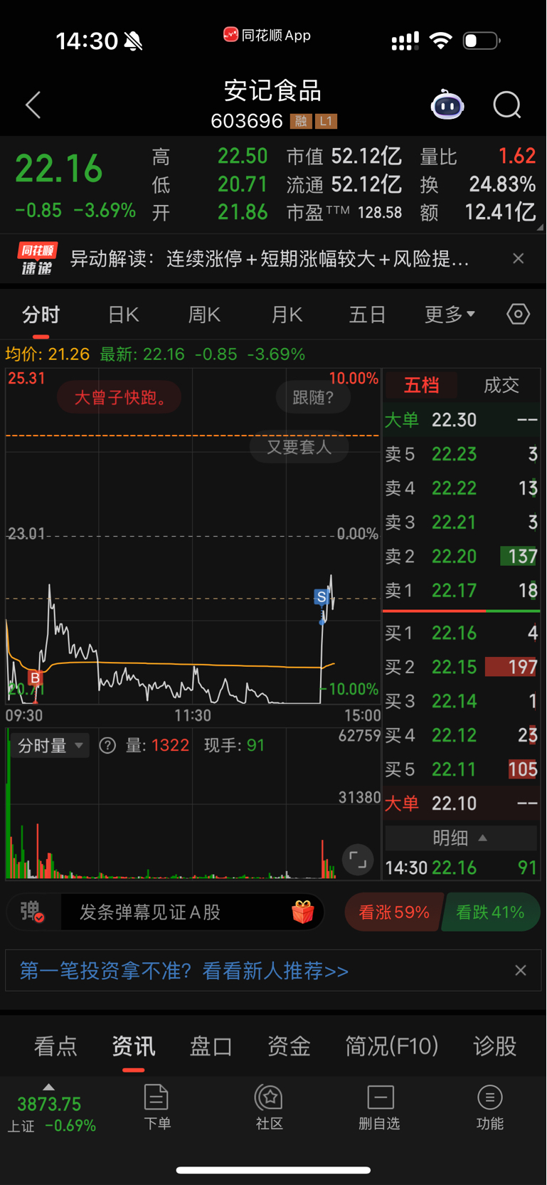 $安记食品(SH603696)$ 幸好做T了,不然要亏20个点,目前亏15个点,麻了