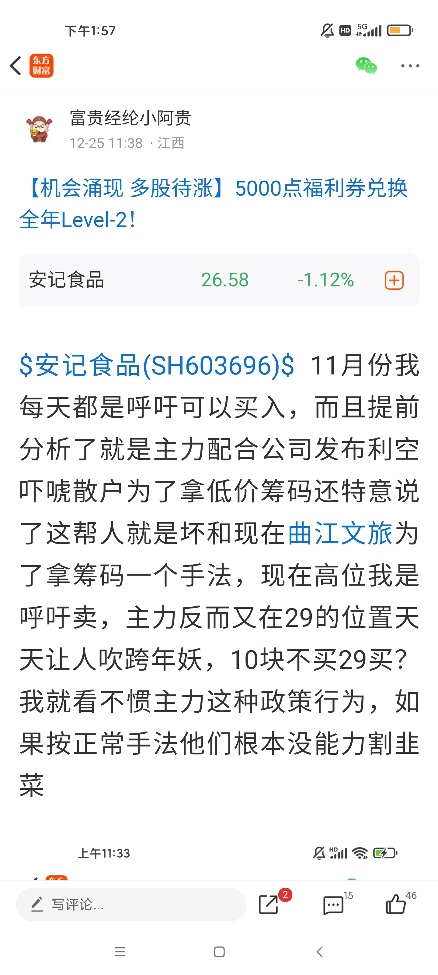 $安记食品(SH603696)$ 我就想问问29买的怎么办,我早上让大家注意风险,不要买还喷我,全网也只有我会提示风险吧,去看看抖音现在还在吹跨年叫大家还要买