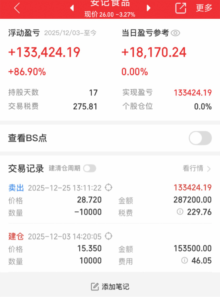 $安记食品(SH603696)$ 历时17个交易日,拿了快一个月,中间也犹豫过,不坚定过,但是还是选择不动,今天做个正式告别。今天出掉,也要去下一个目标坚守了。祝各位一路长虹。