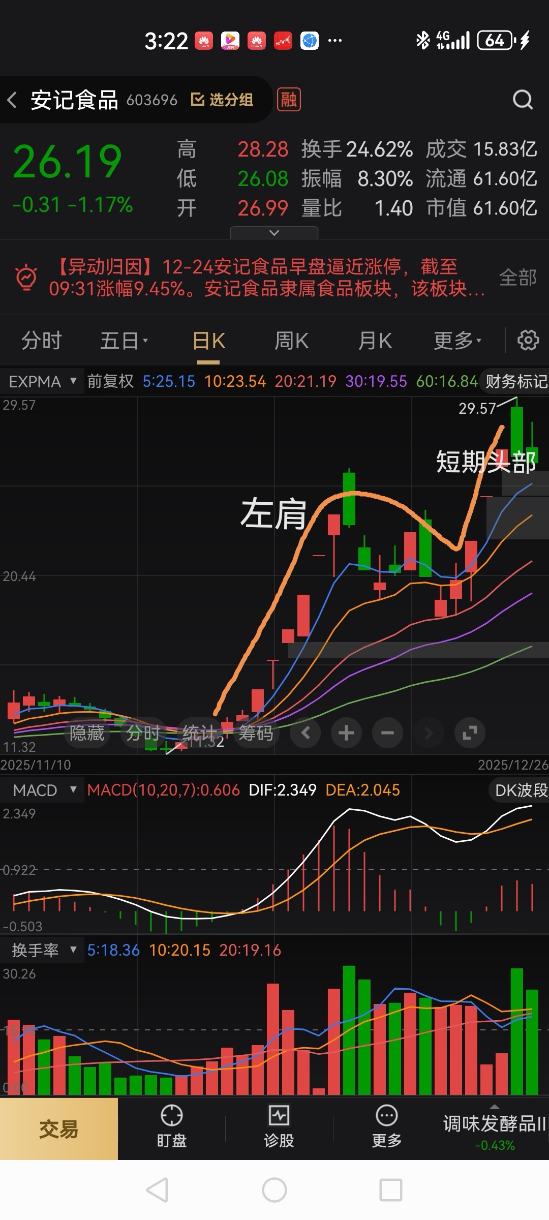 $安记食品(SH603696)$ 安记食品,短期头部已现,下周大概率是阴跌或是暴跌走势,今天放量没有返包成功就是退朝的信号,超预期返包失败就该先获利了结或割肉离场先观望,强躬之末难有所为,主力看到拉不成板干脆反手卖出,不然量不可能放出这木大的