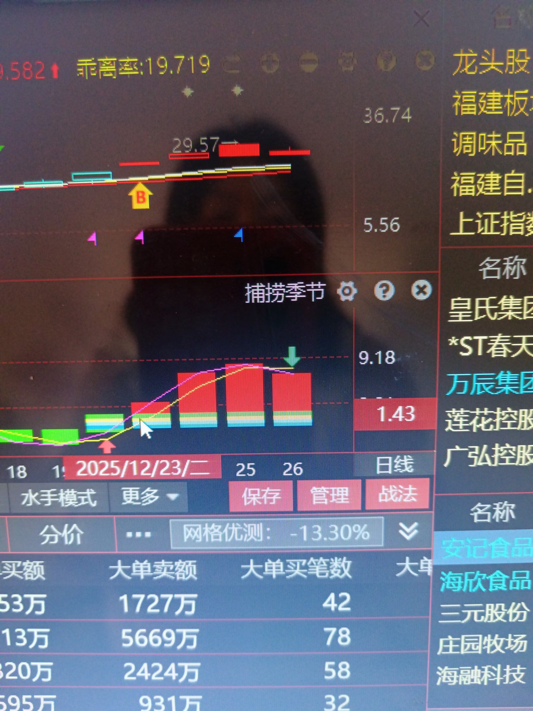 $安记食品(SH603696)$ 捕捞季节死叉,拉高也是卖。一般四个红柱就是卖点。什么股都一样。然后我今天去了。收盘后套了5个点。周一只能止损了。