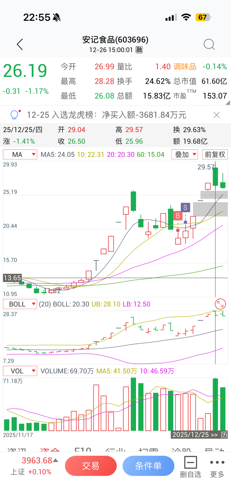$安记食品(SH603696)$ 就吃了八个点。消费股情绪操作太厉害,玩不过。