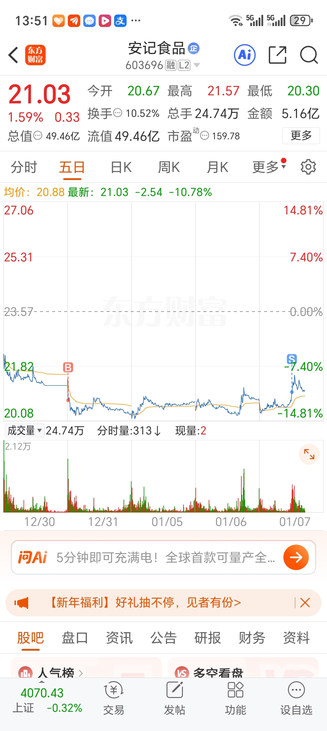 食品(SH603696)$ 记录一下心得体会啊 这次买的时间太心急了 没有买在20.30这个压力位上面 认识到了这次小反弹的底 却太心急了是个错误要谨记 卖的话我是没有感觉卖飞了 在我的想法里这个票的反弹不会超过21.7这个压力位 只是一个小反弹而已 #复盘记录#