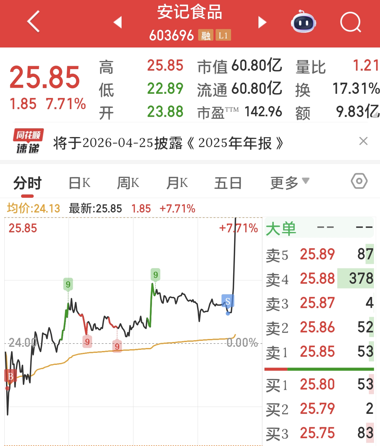 $安记食品(SH603696)$ 兄弟们感谢我吧,主力盯着我