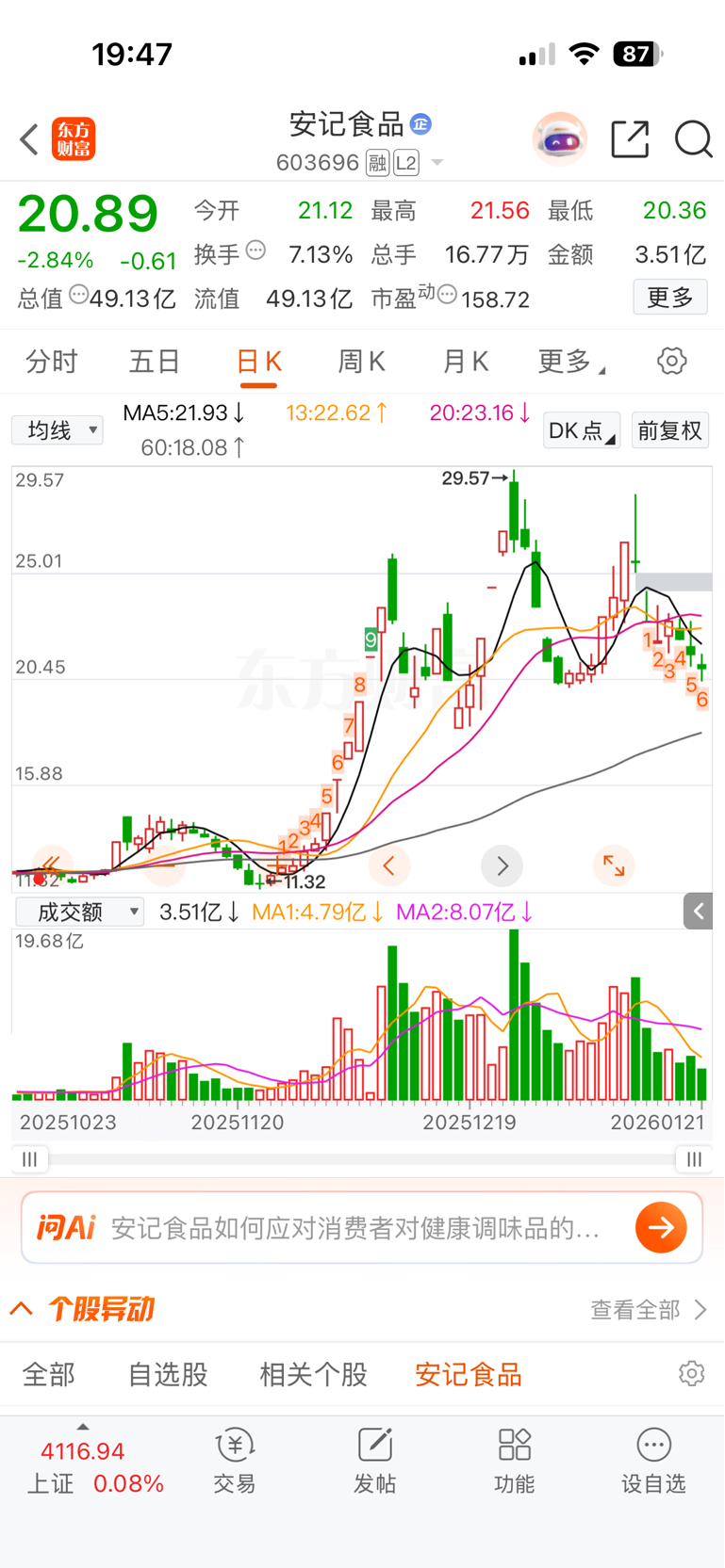 $安记食品(SH603696)$ 这个缩量,筹码峰,是不是代表可以建仓了?