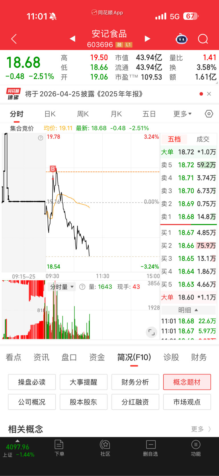$安记食品(SH603696)$ 今天估计得跌停