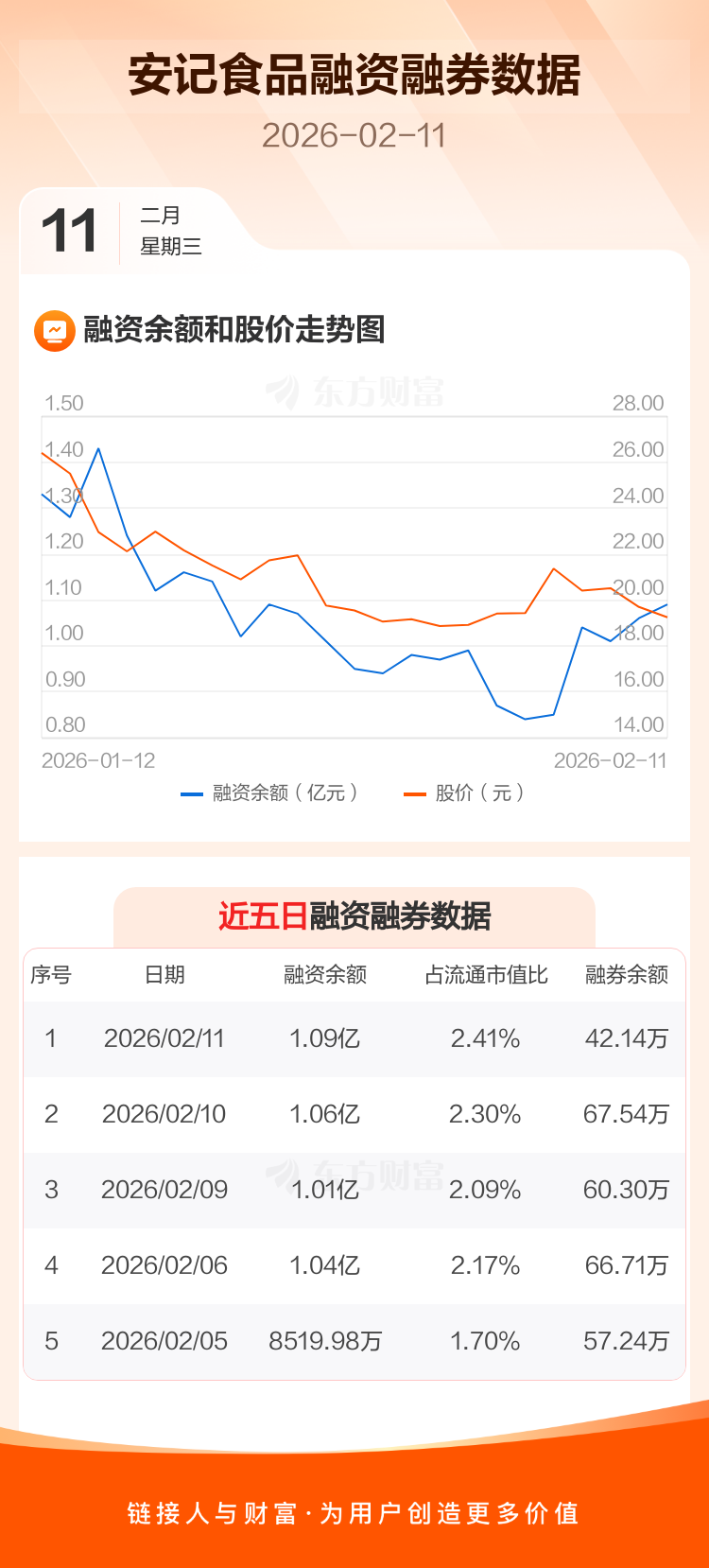 交易所最新数据显示,安记食品于2026年2月11日获融资买入1925.47万元,融资偿还1672.38万元,当日融资净买入253.09万元。目前,该股融资余额1.09亿,占流通市值比例为2.41%。