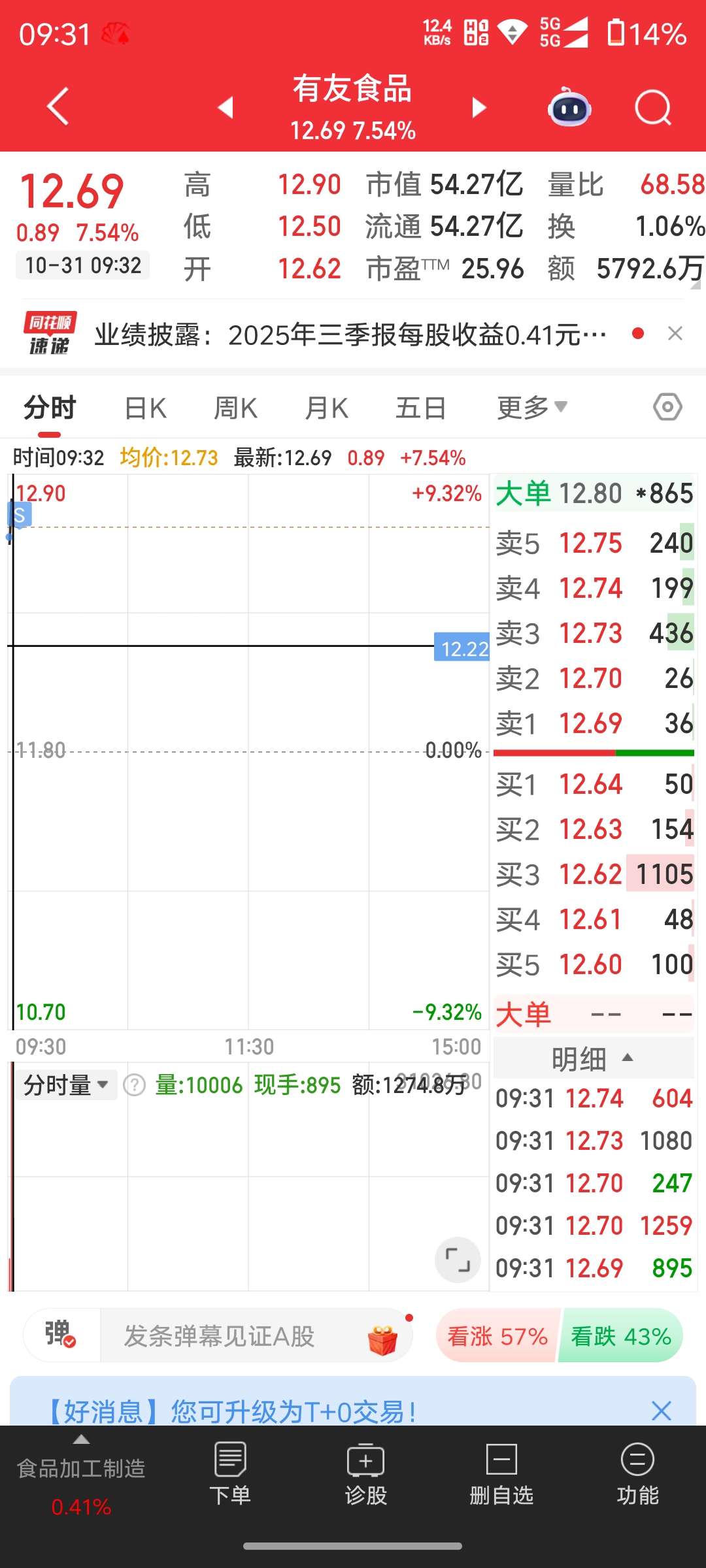 $有友食品(SH603697)$ 兄弟们我怕了,竞价挂的12.58,开盘12.65卖出的,涨停的话就祝兄弟们发财,一路长红