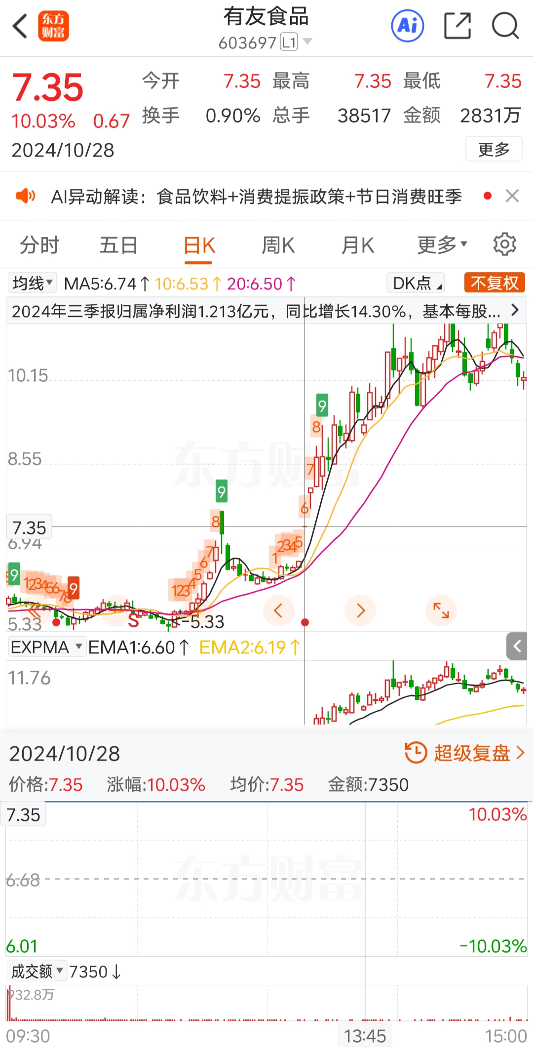 $有友食品(SH603697)$ 兄弟们拿好了,去年也是从三季报发布的时候开始连板的,虽然我卖了但也证明了我选股的方式没什么太大的问题,我先去下一个板块潜伏了。偷偷的进,说出来就不灵了