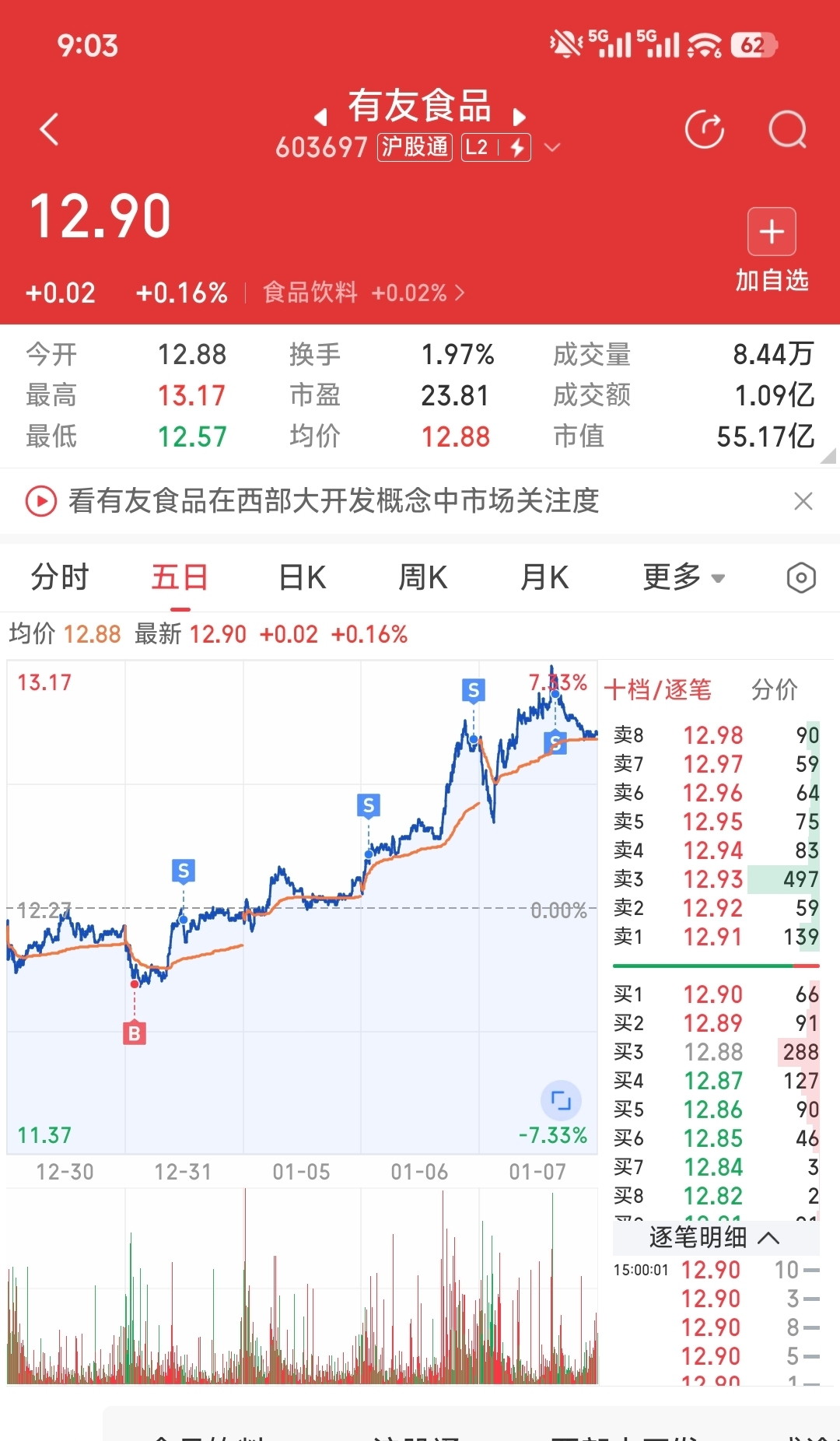 $有友食品(SH603697)$ ,跑了,12-12.5接回来,配合主力的一波又一波