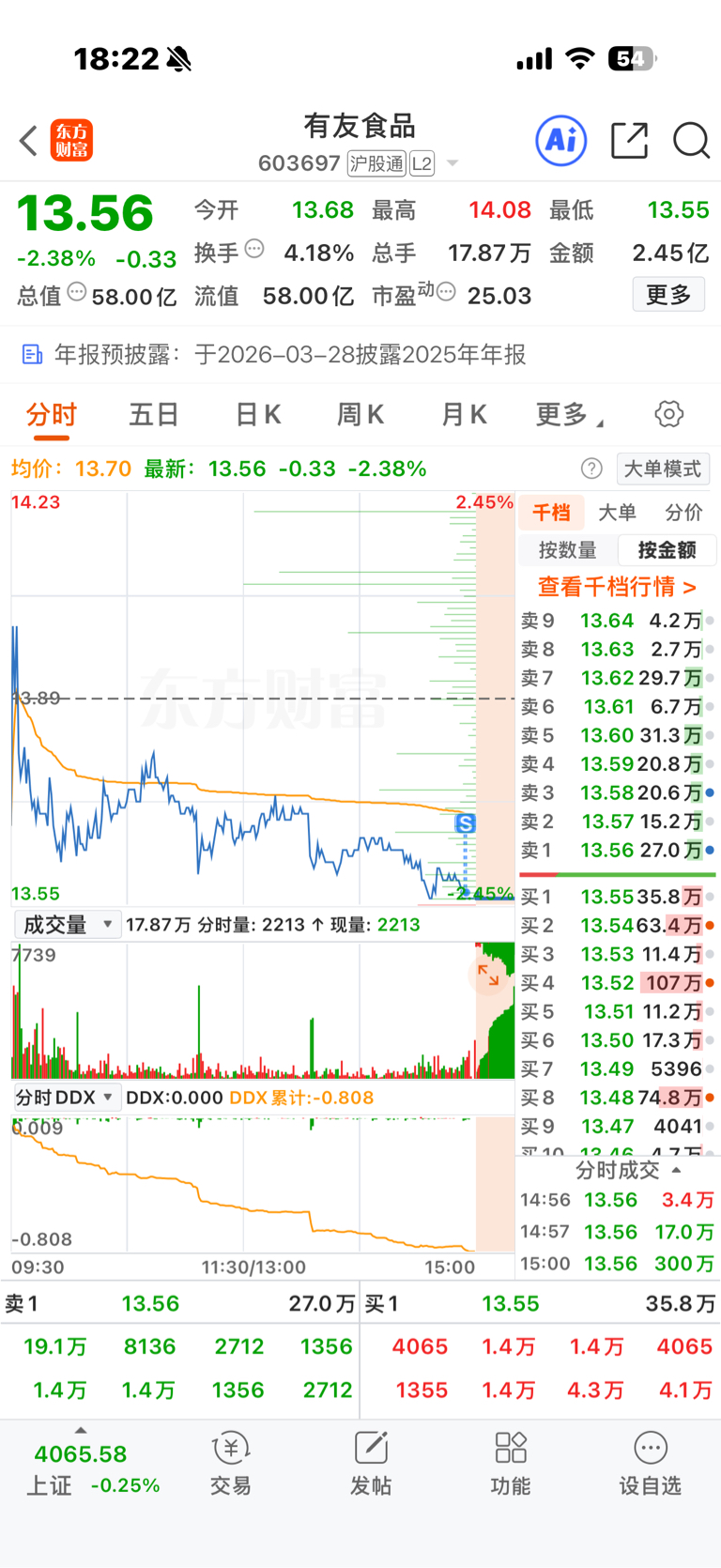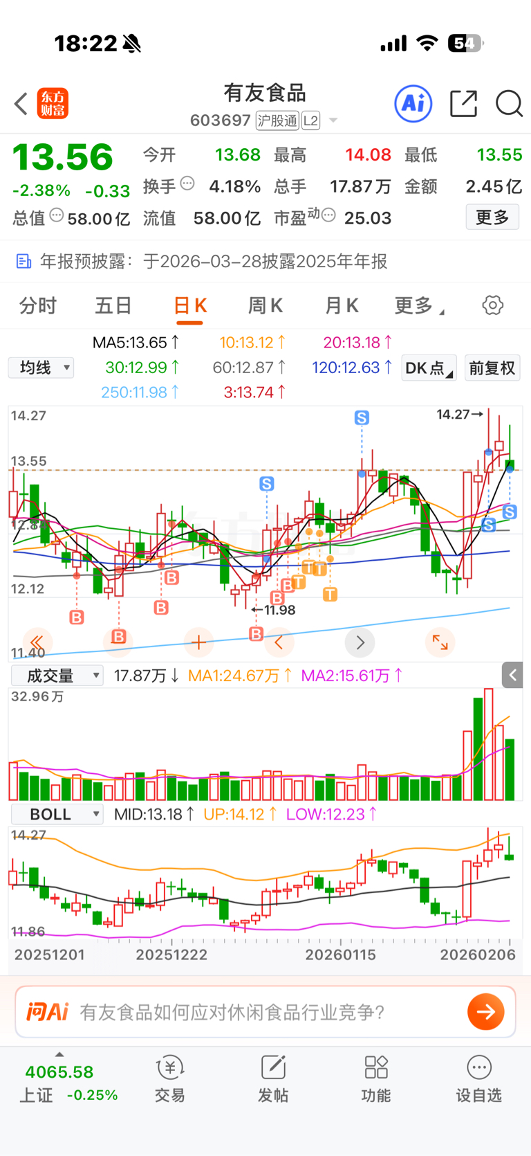 $有友食品(SH603697)$ 收盘跌漏五日线,清仓离场