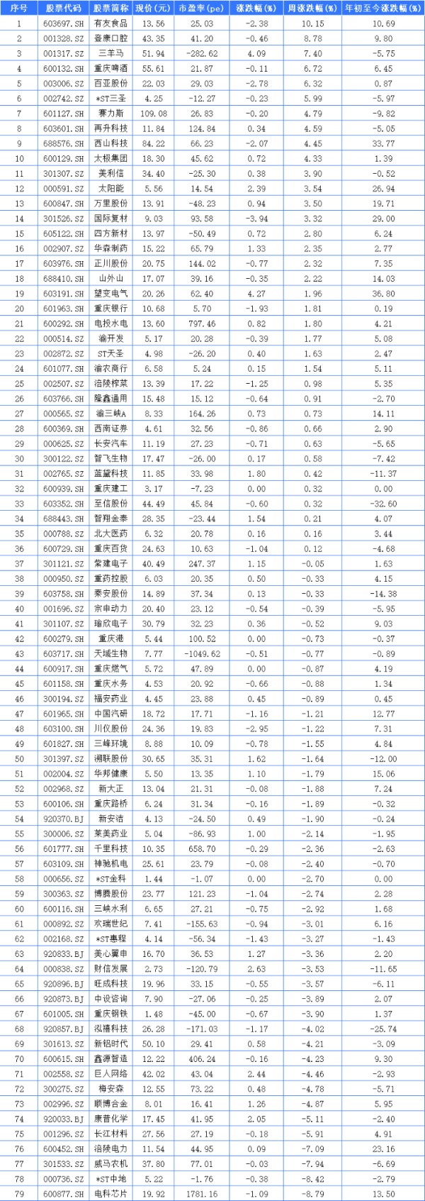 数据显示,79家重庆A股,其中收涨36家,收跌43家。