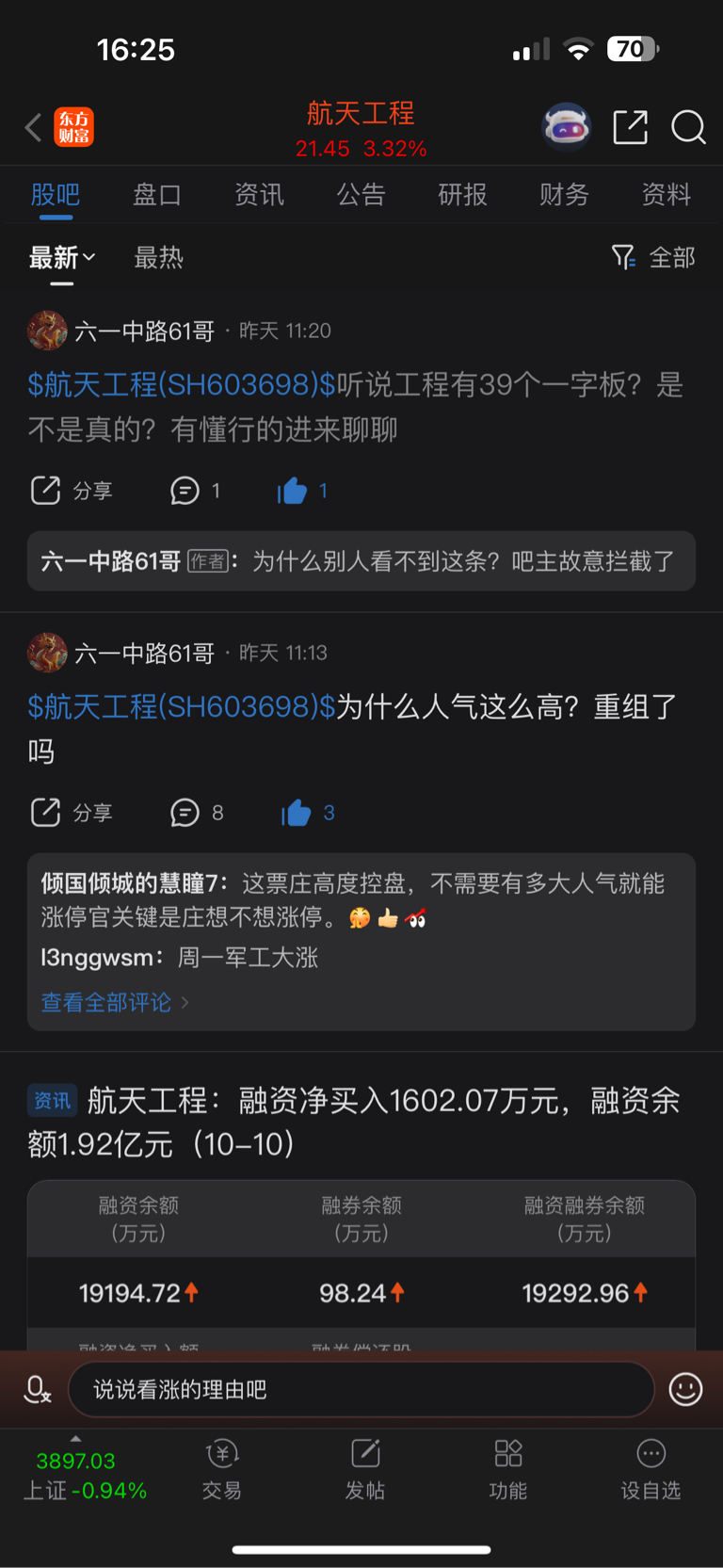 $航天工程(SH603698)$ 为什么被吧主屏蔽?只能自己看到?