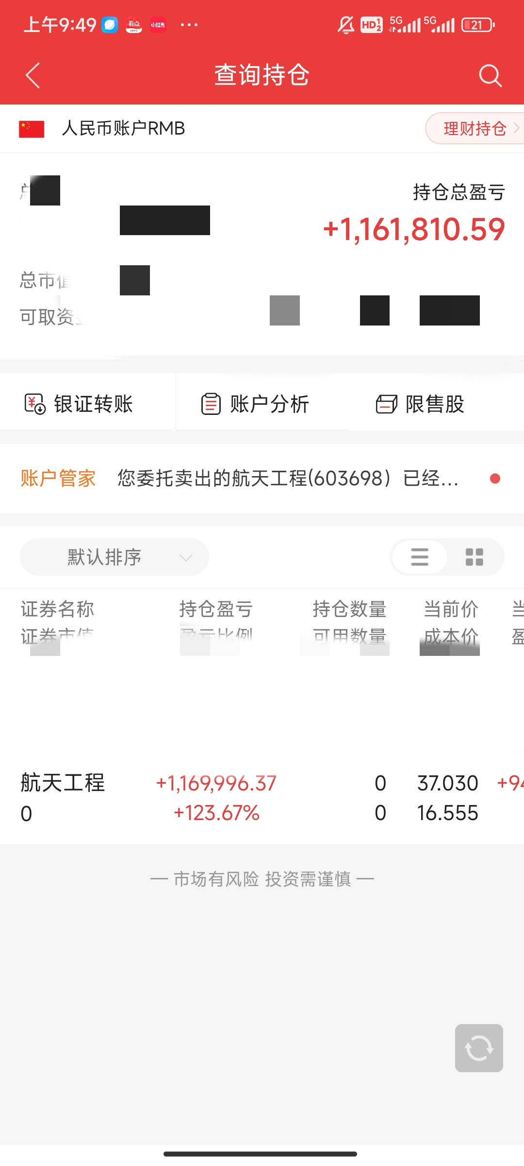 $航天工程(SH603698)$ 成本价16.55,昨天卖了半仓,今天卖了半仓,2023年2月13日全仓一把买进的,历时1041天,涨幅123%