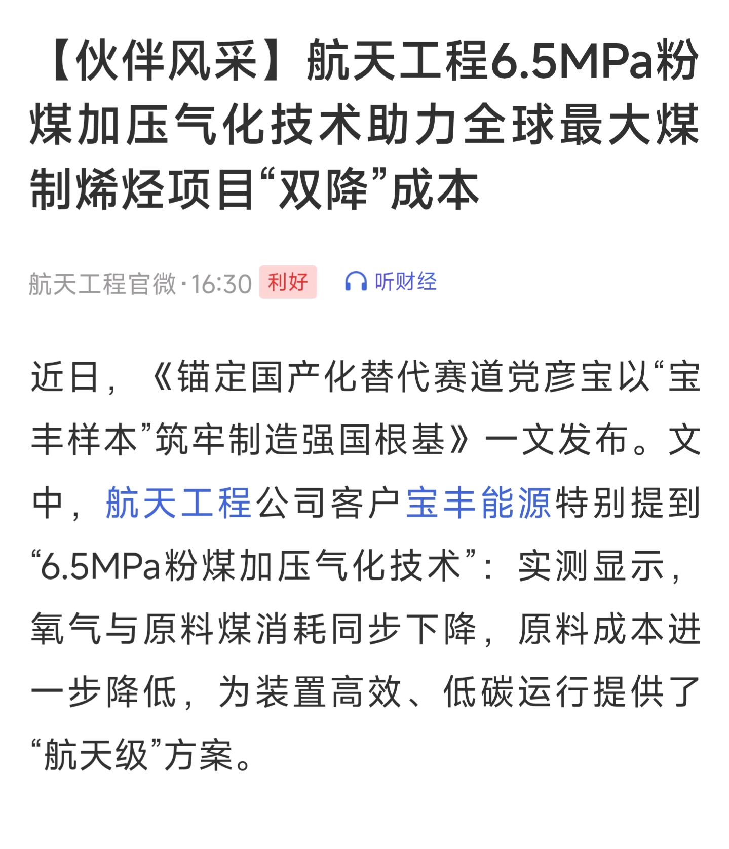 $航天工程(SH603698)$ 航天工程公司客户宝丰能源特别提到“6.5MPa粉煤加压气化技术”:实测显示,氧气与原料煤消耗同步下降,原料成本进一步降低,为装置高效、低碳运行提供了“航天级”方案。