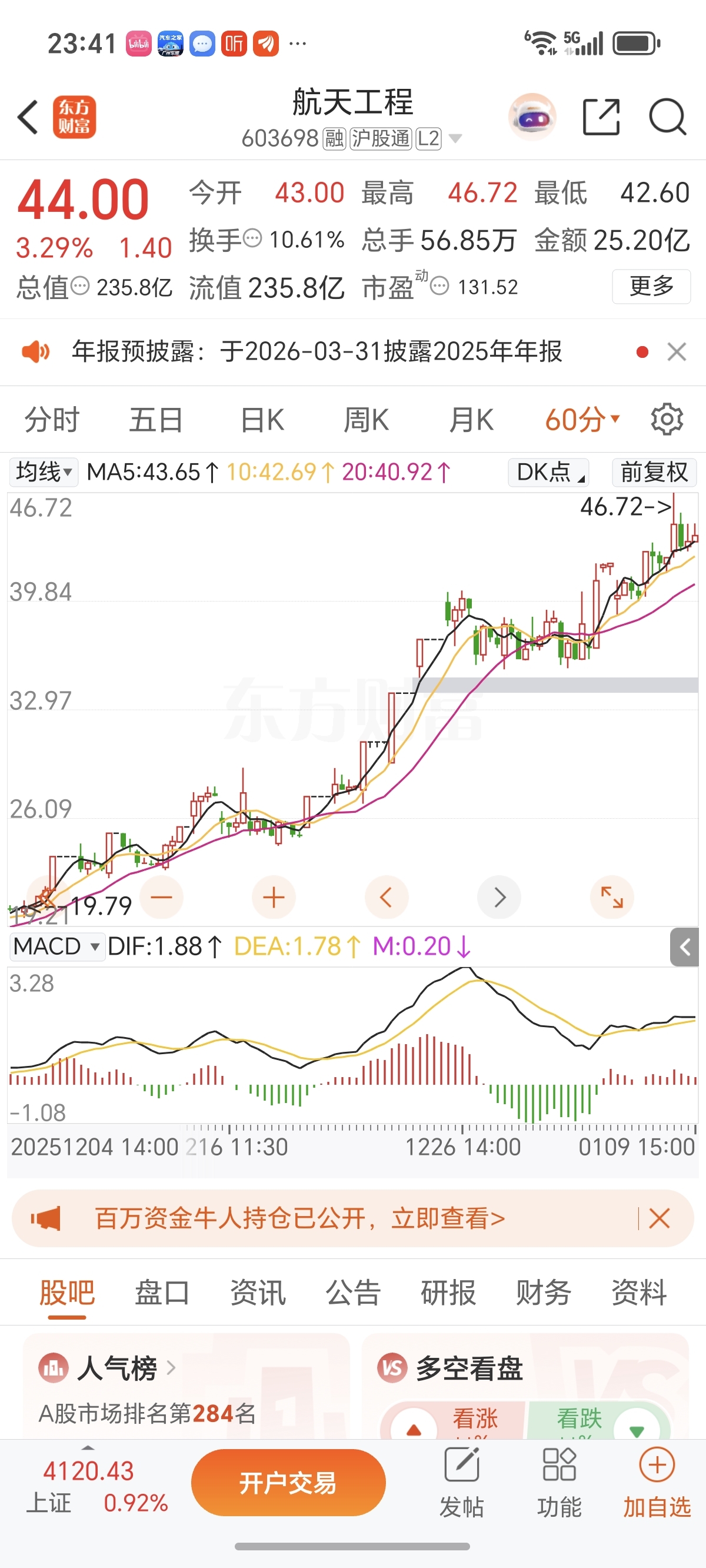 下周一还是看涨了,折腾了我一晚上,毕竟投资比较大,首先看60分钟K线这是炒短线的,MACD和成交量都向上走势,看好。再看5时线黑色那根一直站在十时线上方,且股价一直高于五时线,记住这里是五时线不是五日线。一会再研究这比这样搞是吸筹还是洗盘。不过它这样搞,下周一短线玩意真受不了。