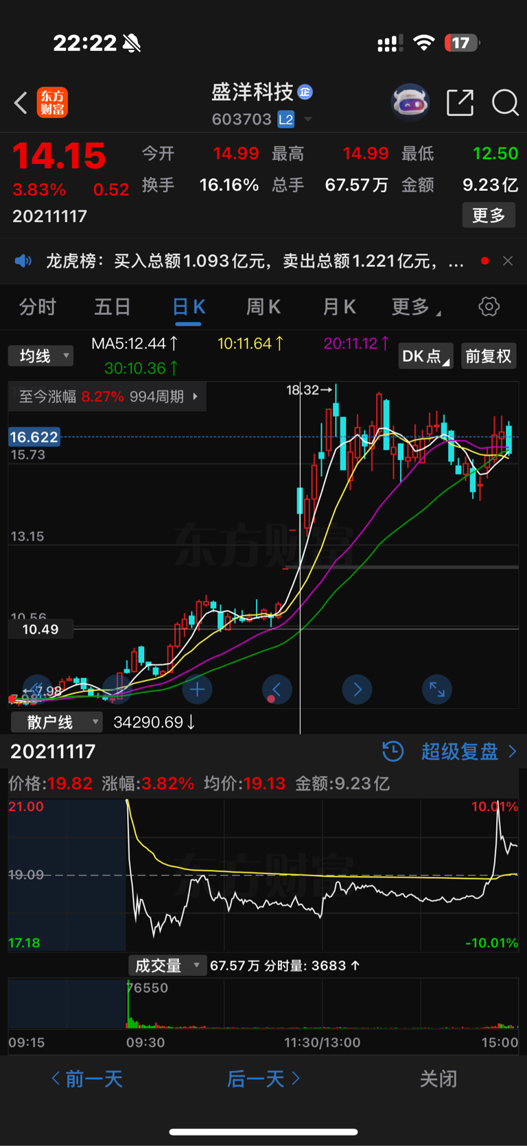 $盛洋科技(SH603703)$ 和21年这波很像,唯一不同的是之前那次尾盘又反包回去了,而这次没有,行情绝对没走完,看主力周一如何反包吧