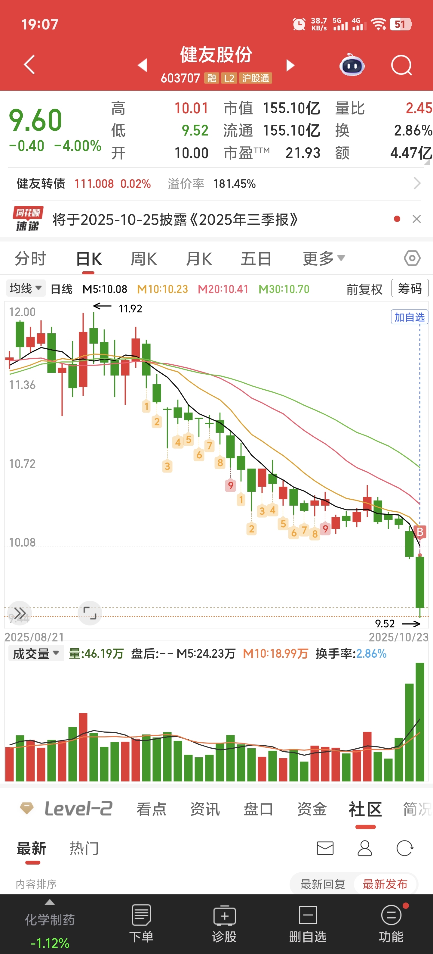 $健友股份(SH603707)$ 这两天放量大跌,今天还破了近几年新低,近期博个反弹