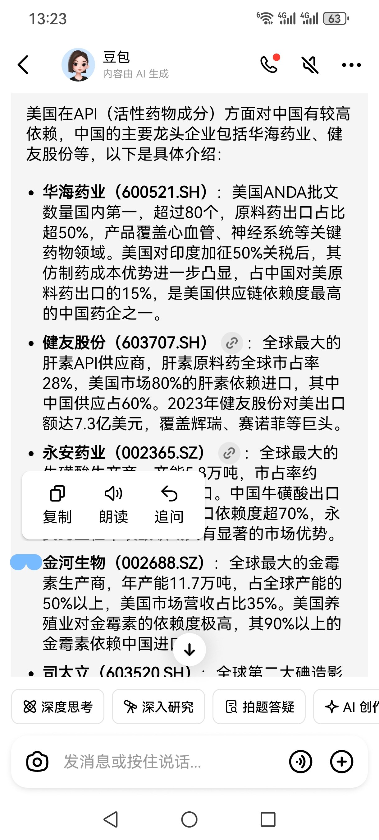 健友股份 :全球最大的肝素API供应商,肝素原料药全球市占率28%,美国市场80%的肝素依赖进口,其中中国供应占60%。2023年健友股份对美出口额达7.3亿美元,覆盖辉瑞、赛诺菲等巨头。