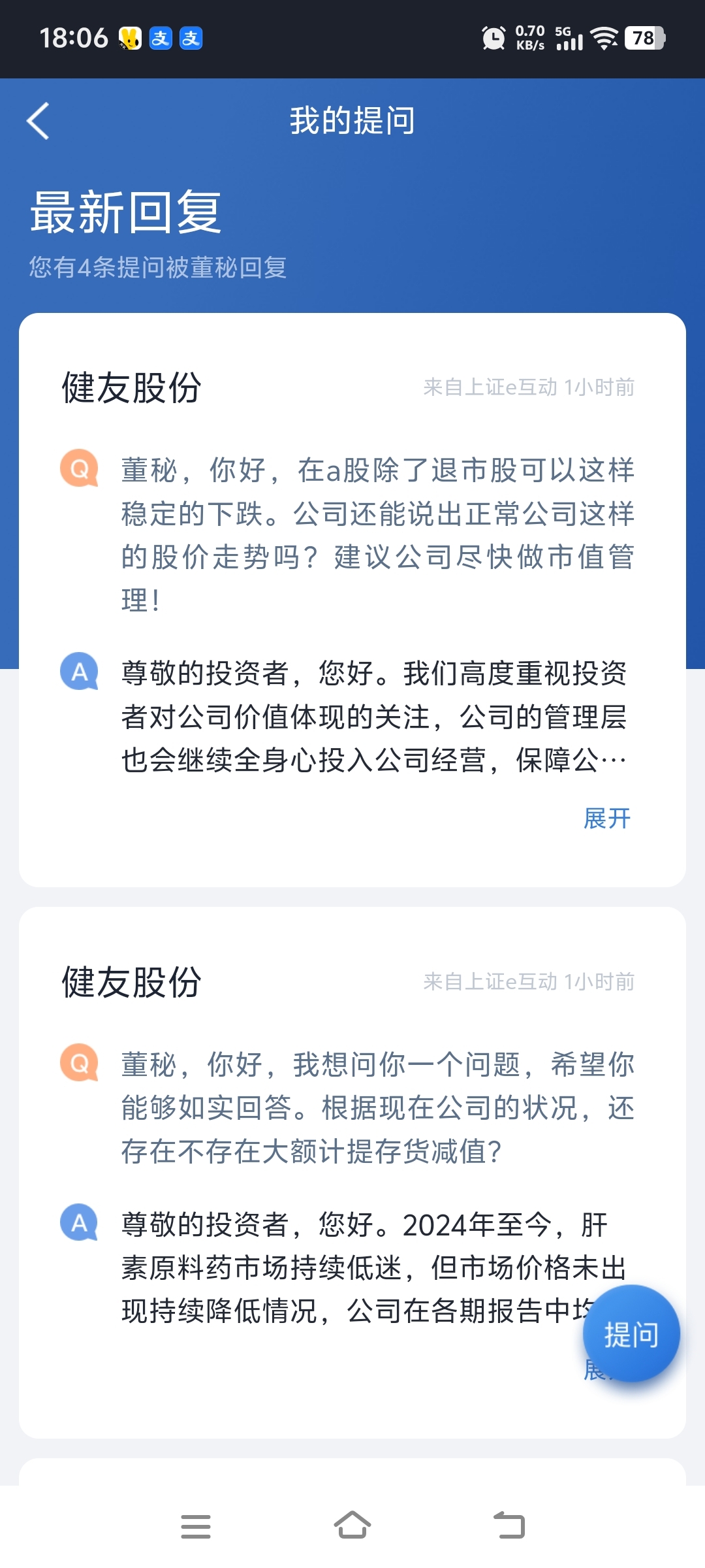 今天董秘回答的问题都是我提问的,还有一条他没有回复,大家都问问他。