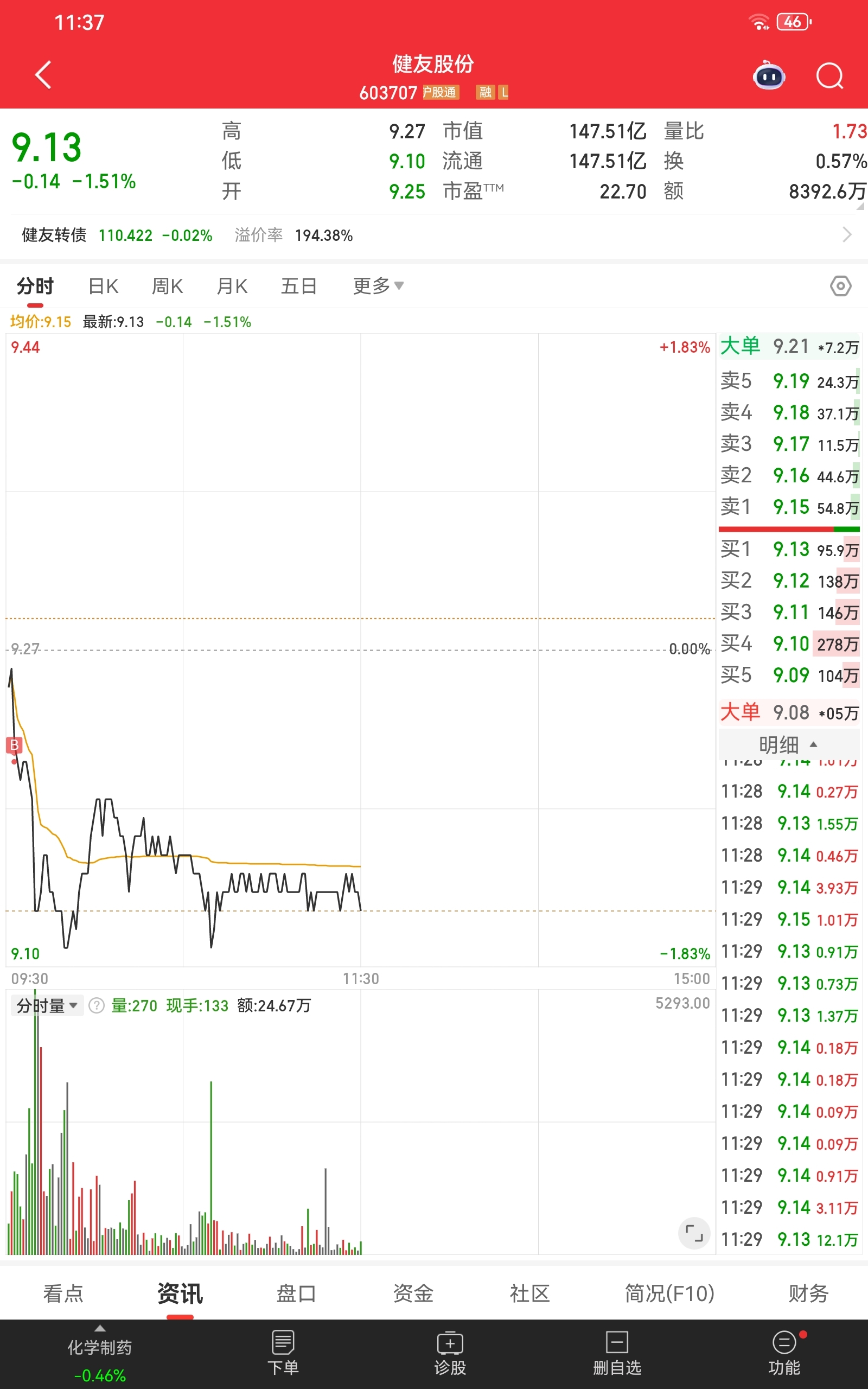 $健友股份(SH603707)$ 9.21买了一点点,买完就后悔,只能下周一割肉了!