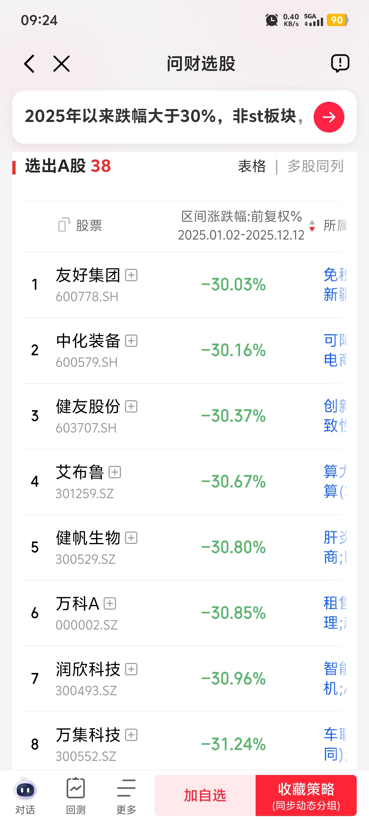 $健友股份(SH603707)$ 上市时间大于一年,排除st板块,今年来跌幅30%以上共38只。$健帆生物(SZ300529)$ $万 科A(SZ000002)$ 榜上有名。