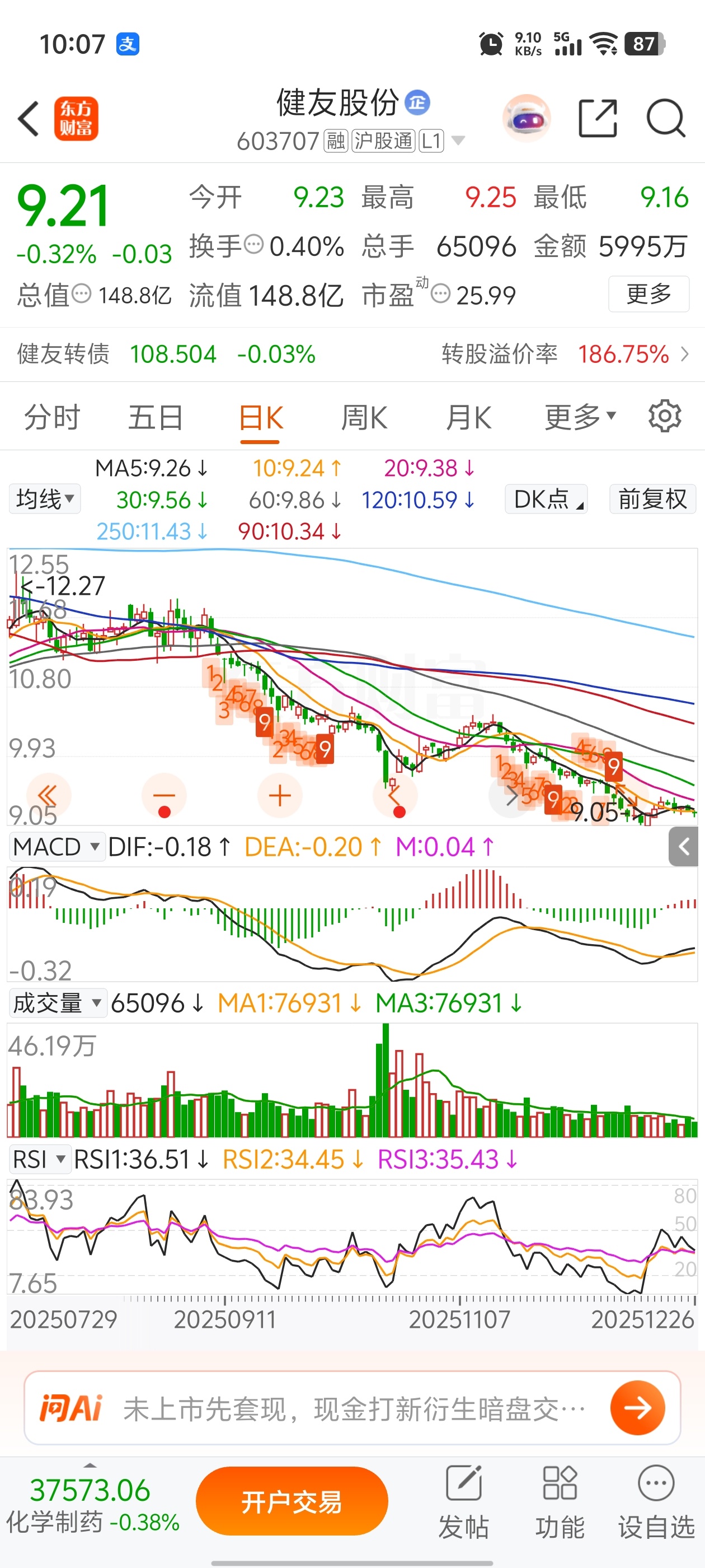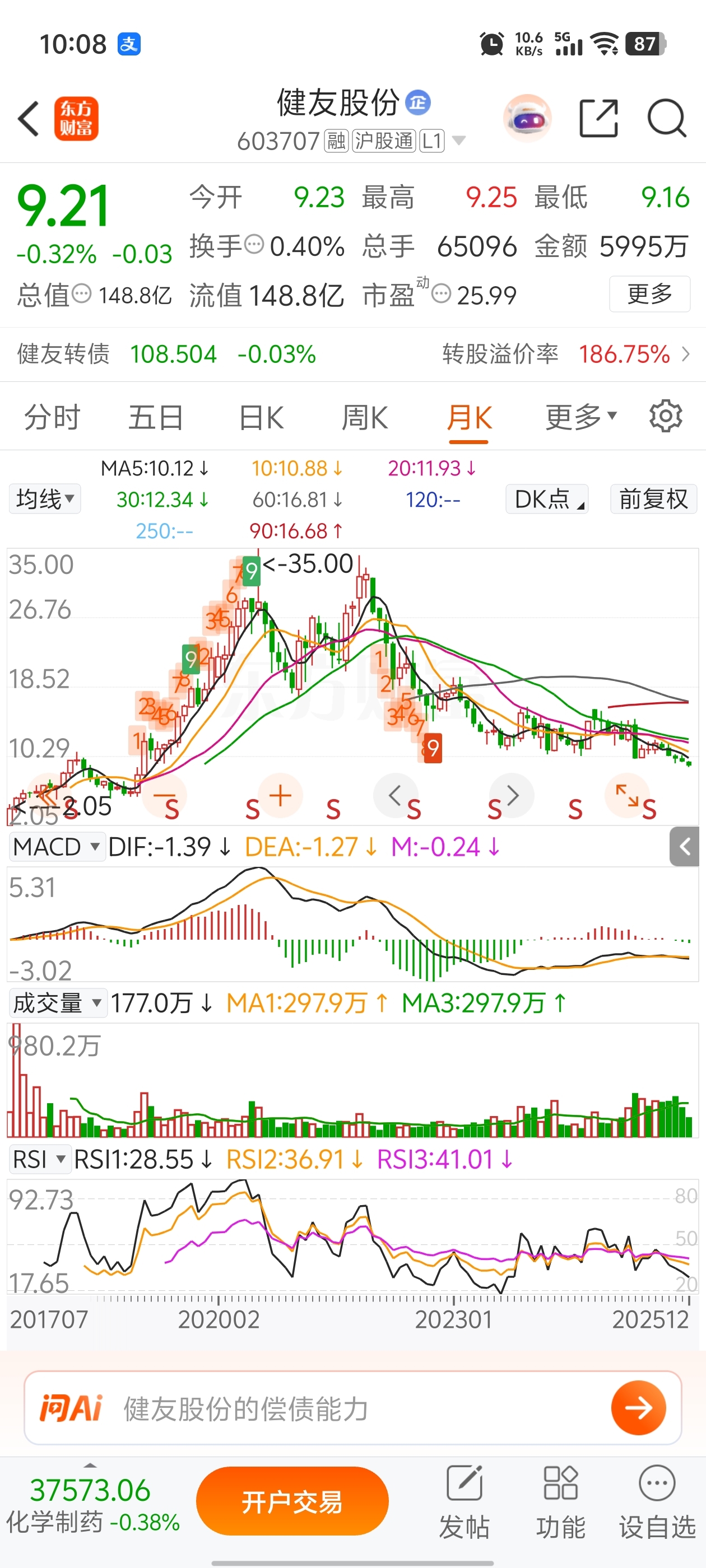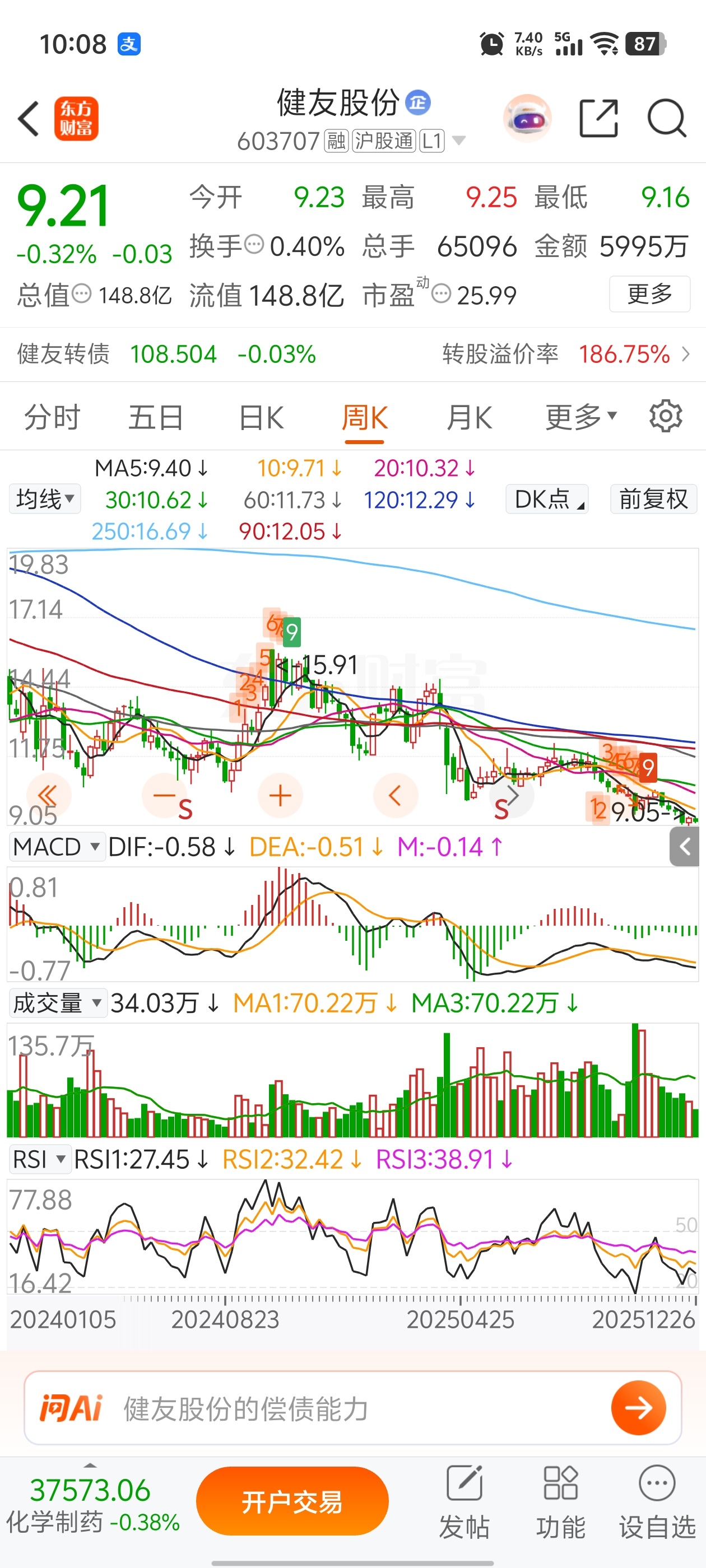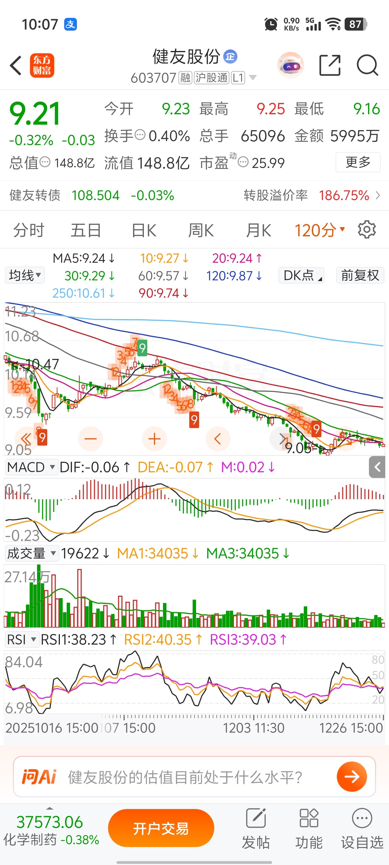 $健友股份(SH603707)$ 跌了整整4年,没有人敢唱多了。但从技术面看日线macd底背离且金叉,周线、月线级别的macd底背离进行中,如果继续下跌可能形成120分钟线macd底背离,界时应该是一个很好的介入机会。股票涨涨跌跌很正常,但象不跟板块,不跟大盘,难道真要退市不成,本人刚刚介入不久,略略套了点,套牢不可怕,可怕的暴大雷。